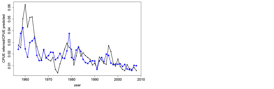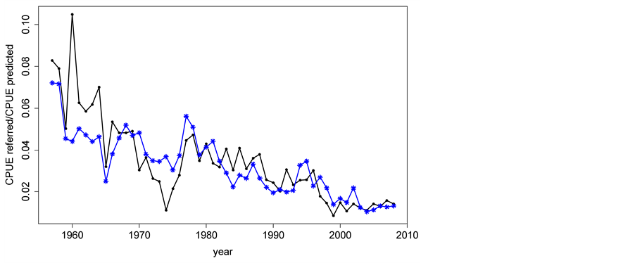 Figure 9. Graph showing the CPUE time series trajectory of the yellowfin tuna (T. albacares) stock in Zone 3 for the years 1957-2008. The referred CPUE is shown in black and the trajectory which resulted from model vii (Table 3) is shown in blue.