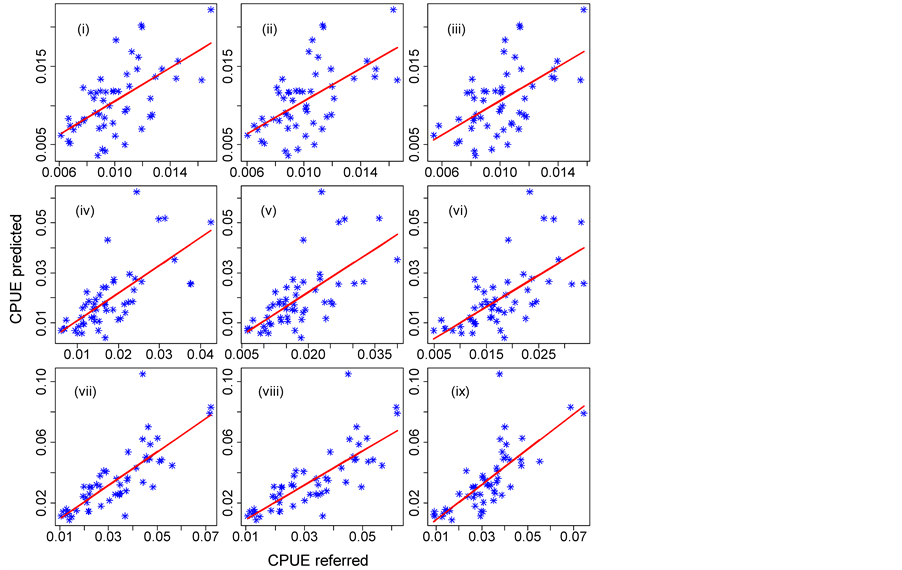 Figure 7 shows the plot of CPUE of the yellowfin tuna (T. albacares) in Zone 1 and the CPUE trajectory from model (i) (Table 3). The CPUE predicted seems to fit quite well with the CPUE referred. In Figure 8 and Figure 9 the referred CPUE trajectory of yellowfin tuna in in Zone 2 and Zone 3 are shown with the CPUE trajectory resulting from model (iv) and (vii) (Table 3). The fitness of the predicted CPUE with the referred CPUE is highest for Zone 3 followed by Zone 2 and Zone 1. The linear correlations of the models shown in Table 3 are shown in Figure 10. The determination coefficients for the yellowfin tuna CPUE referred for Zone 1, Zone 2 and Zone 3 against the CPUE predicted from models (i), (iv) and (vii) (Table 3, Figure 10) are 0.602, 0.698 and