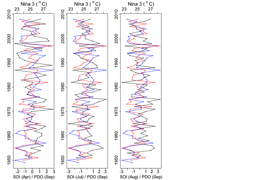 Figure 12. Relationship of the SOI incorporated into the models for Zone 1 (Ia), Zone 2 (Ij) and Zone 3 (Ig) (black line) with the climatic conditions of the Pacific Decadal Oscillation (PDO) for the month of September (blue line) and Niña 3 (red line) which is the Eastern Tropical Pacific sea surface temperature (5˚N - 5˚S 150˚W - 90˚W). SOI exhibits negative relationship with both PDO and Niña 3. La Niña episodes occur during positive SOI while El Niño events happen during negative SOI.