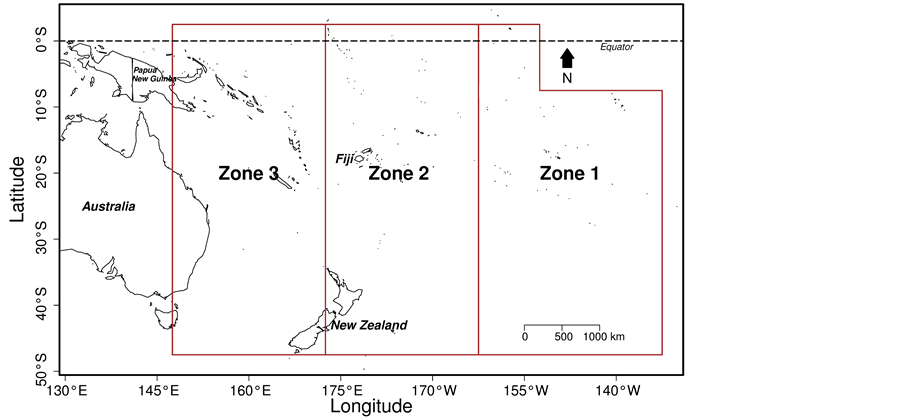 Figure 1. Map of the Eastern and Western South Pacific region showing the stock distribution of the yellowfin tuna (T. albacares). The region is divided into Zone 1, Zone 2 and Zone 3 shown by the enclosure polygons.
