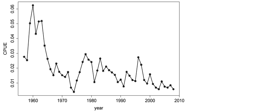where m = 1, 2, 3. The dependent variable and y-intercept were log transformed to reduce the effects of skewness and outliers. Various combination or the independent variables were investigated by successive elimination for the linear model and with polynomial combinations of the independent variables for Equation (1) and Equation (2) to identify suitable models for explaining the trajectory of the yellowfin tuna stock in the three zones of the South Pacific region. The residuals of the model against the fitted values were tested for homogeneity of variance. If the range of variance were ≥4.00 then the least square estimators will be significantly degraded [26] . For model selection criteria, we used the Akaikes Information Criterion (AIC) and R2 values at p < 0.05 with condition of significant parameter estimates at p < 0.05 [27] . The referred trajectory of the CPUE was plotted with the predicted CPUE of the yellowfin tuna in Zone 1, Zone 2 and Zone 3 and compared. All statistical analysis for this study was carried out using the statistical software “R”, version 3.0.1 [28] .