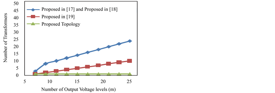 To make clear the understanding of the evolution of the transformer based multilevel inverter structures are presented in Figure 19. The main motivation of this work is development of transformer based multilevel inverter with reduced number of components. As shown in Figure 20(a), the proposed topology requires fewer numbers of power switches than other topologies. For example, for a seven-level inverter, the presented inverter utilizes 5 power switches. However, other structures utilized more number of power switches than proposed topology. Figure 20(b) shows the comparison of the gate drivers with other structures. For example, for a seven-level inverter, the presented inverter utilizes 5 gate drivers. However, in the cascaded H-bridge multilevel inverter 12 gate drivers are required. Reduction of the gate drivers reduces the overall implementation cost, circuit complexity and increases the system reliability.
