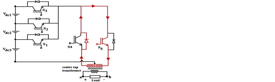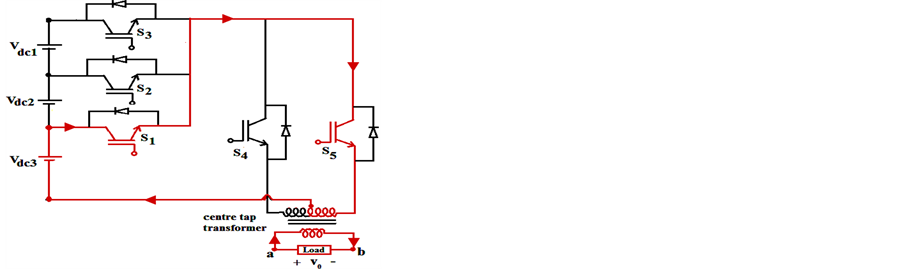 . When switches S3 and S4 are kept ON, three sources (Vdc1, Vdc2 and Vdc3) are connected in series, and supply energy to the load. The load current flows from the terminal a to b and the voltage across the load terminals are +3Vdc.