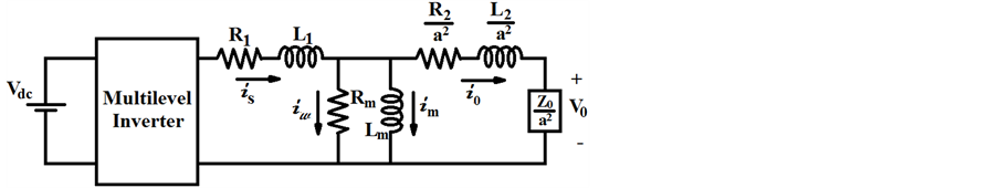 The output voltage of the inverter circuit is the secondary voltage across the load. To facilitate the analysis of the circuit, the secondary impedance and the load impedance are referred to the primary winding as shown in Figure 5 with a load impedance of