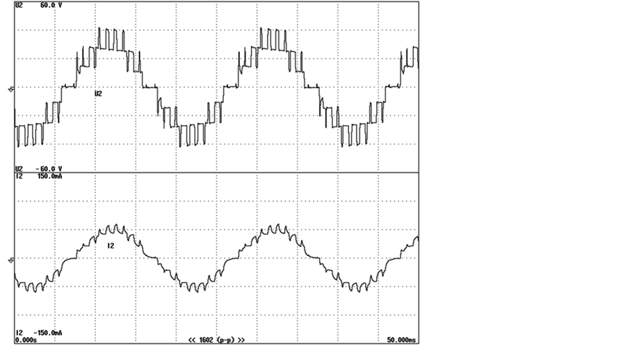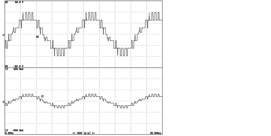 Figure 16. Experimental inverter output voltage and current for R-L load. (x axis: 3.33 ms/div, y axis: 30 V/div and 0.5 A/div).