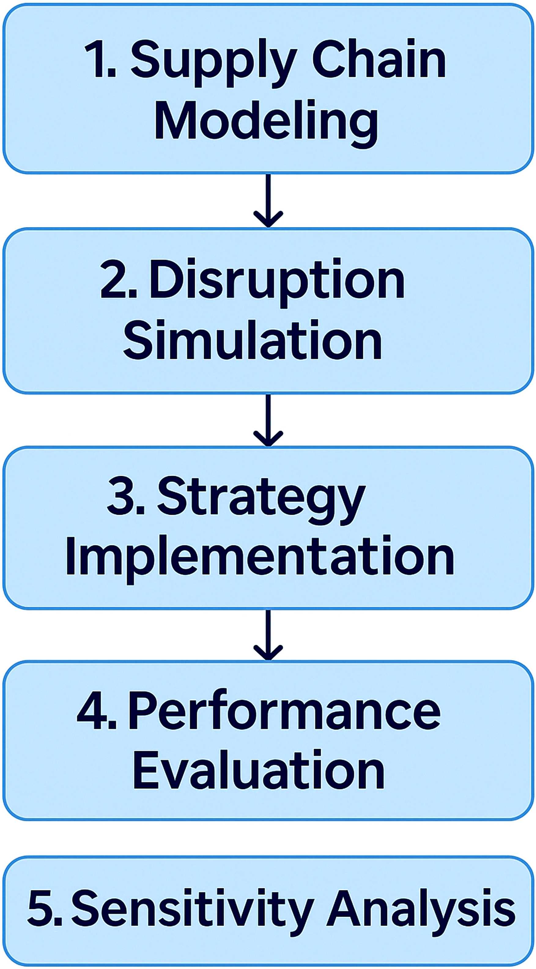 This study adopts a simulation-based approach to evaluate and optimize medical supply chain resilience under pandemic conditions. The methodology was structured in several phases: modeling the baseline supply chain, defining realistic disruption scenarios, implementing resilience strategies, and assessing their performance using quantitative metrics (Figure 1).