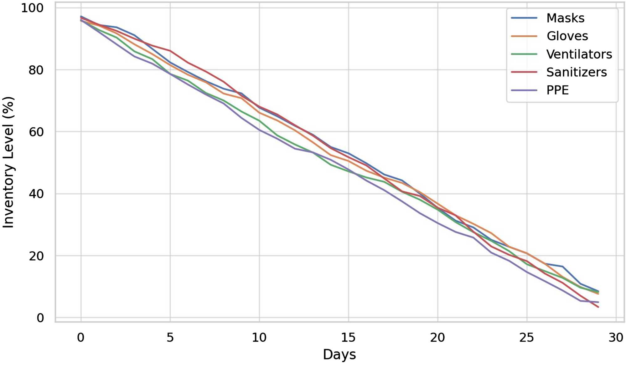 This line graph Figure 2 shows inventory levels across five key medical supply categories. A steep decline is visible within the first two weeks, emphasizing the system’s unpreparedness.