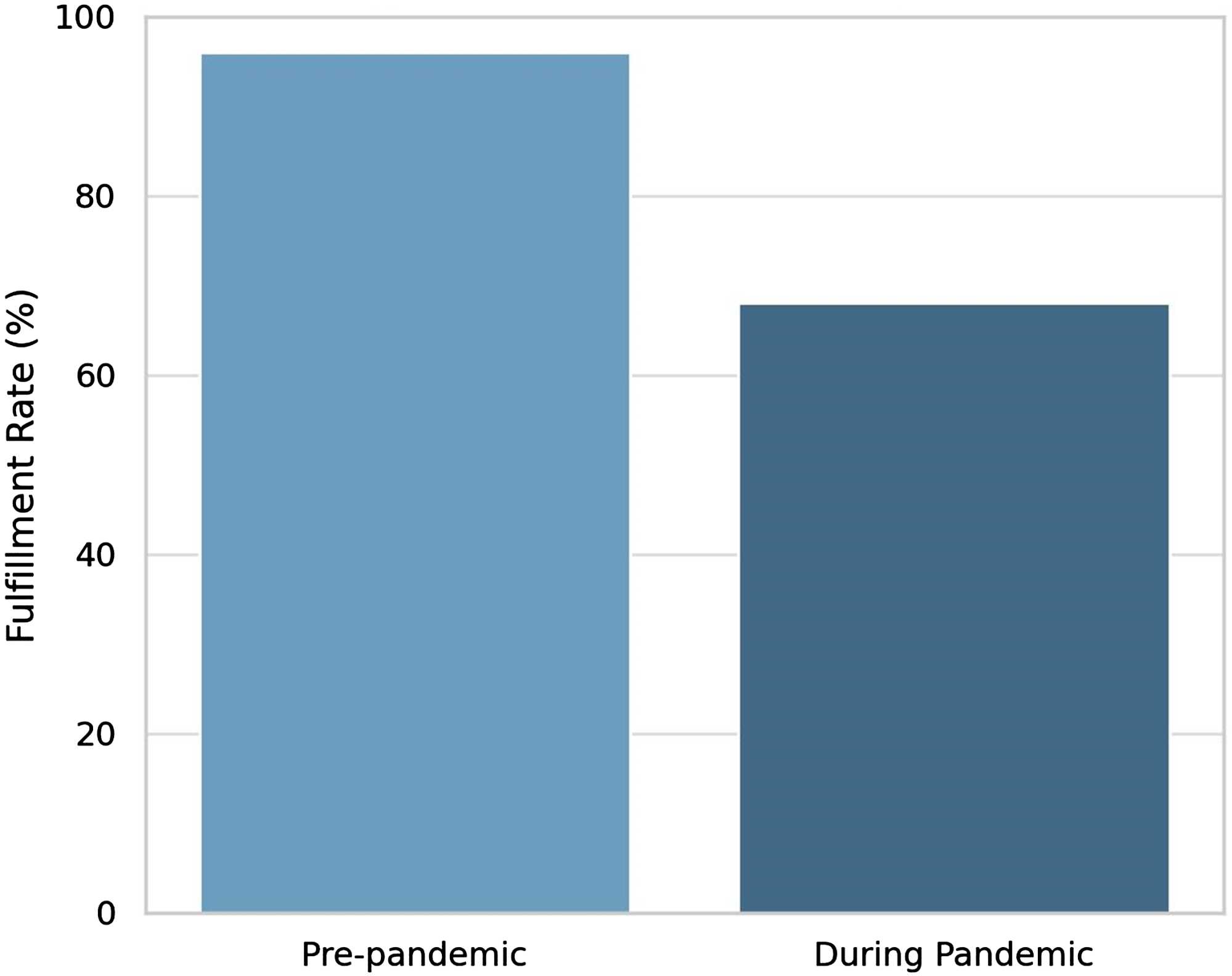 This bar chart (Figure 3) compares average fulfillment rates in the normal vs. pandemic periods, showing a 28% decrease. It demonstrates how supply systems collapse under stress without intervention.