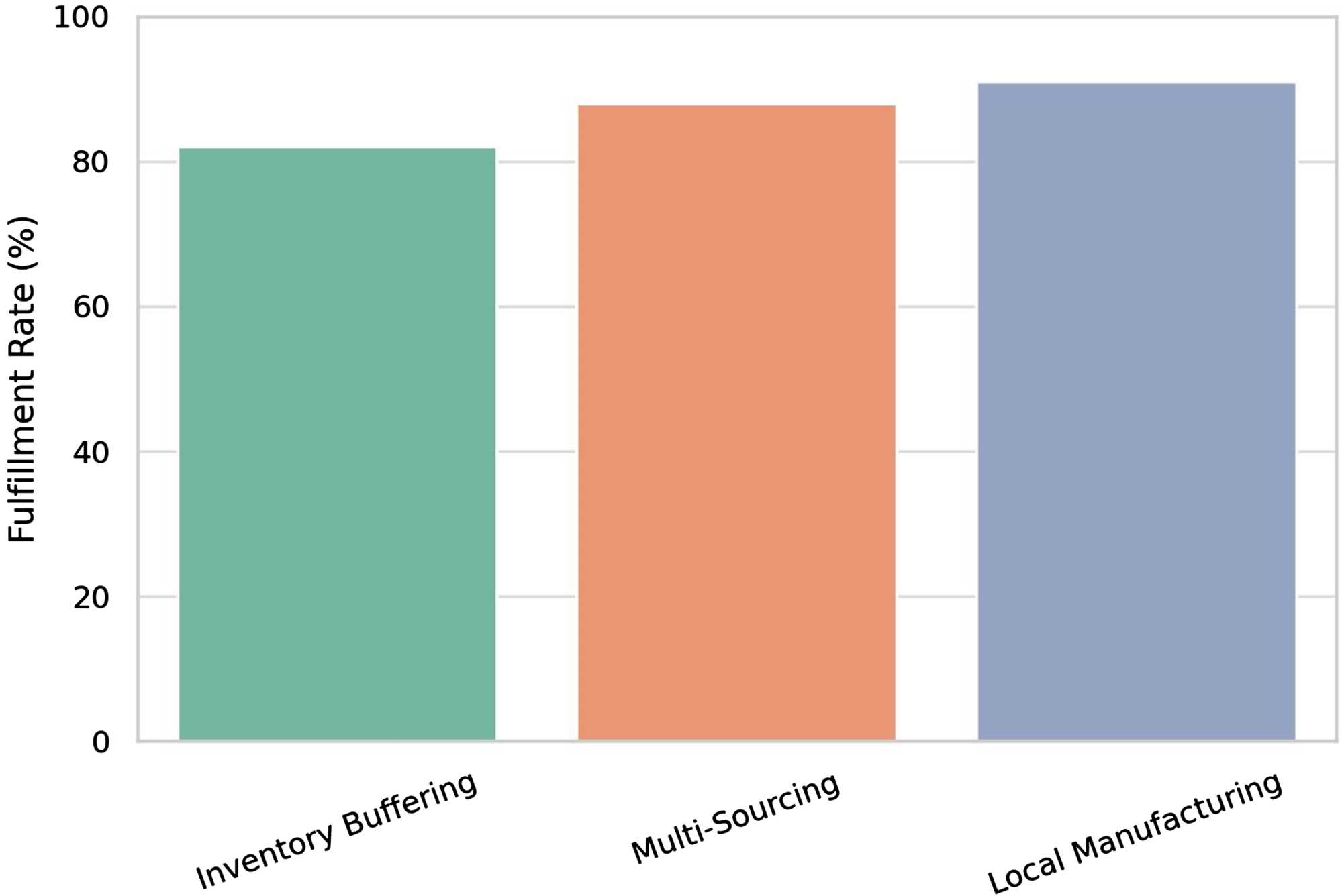 Three strategies were tested separately to analyze their contribution to resilience: Among the strategies, Local Manufacturing achieved the highest fulfillment rate (91%) and the lowest shortfall (4 days), as shown in Table 2.