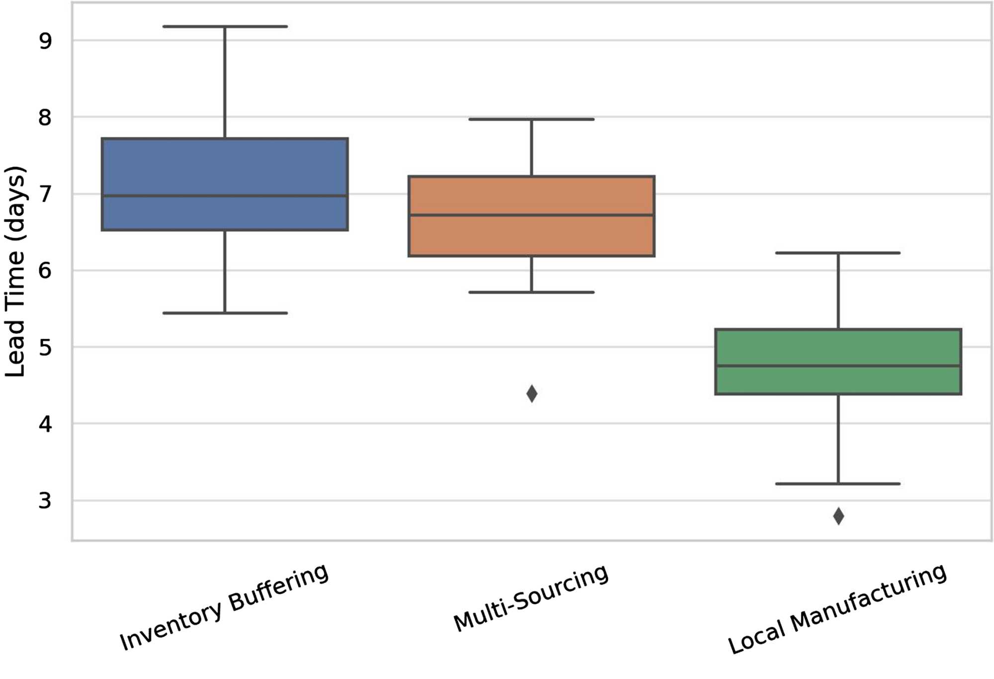 A boxplot visualization showing minimum, maximum, and average lead times across the three strategies. Local Manufacturing produces the most stable and shortest lead times (Figure 5).