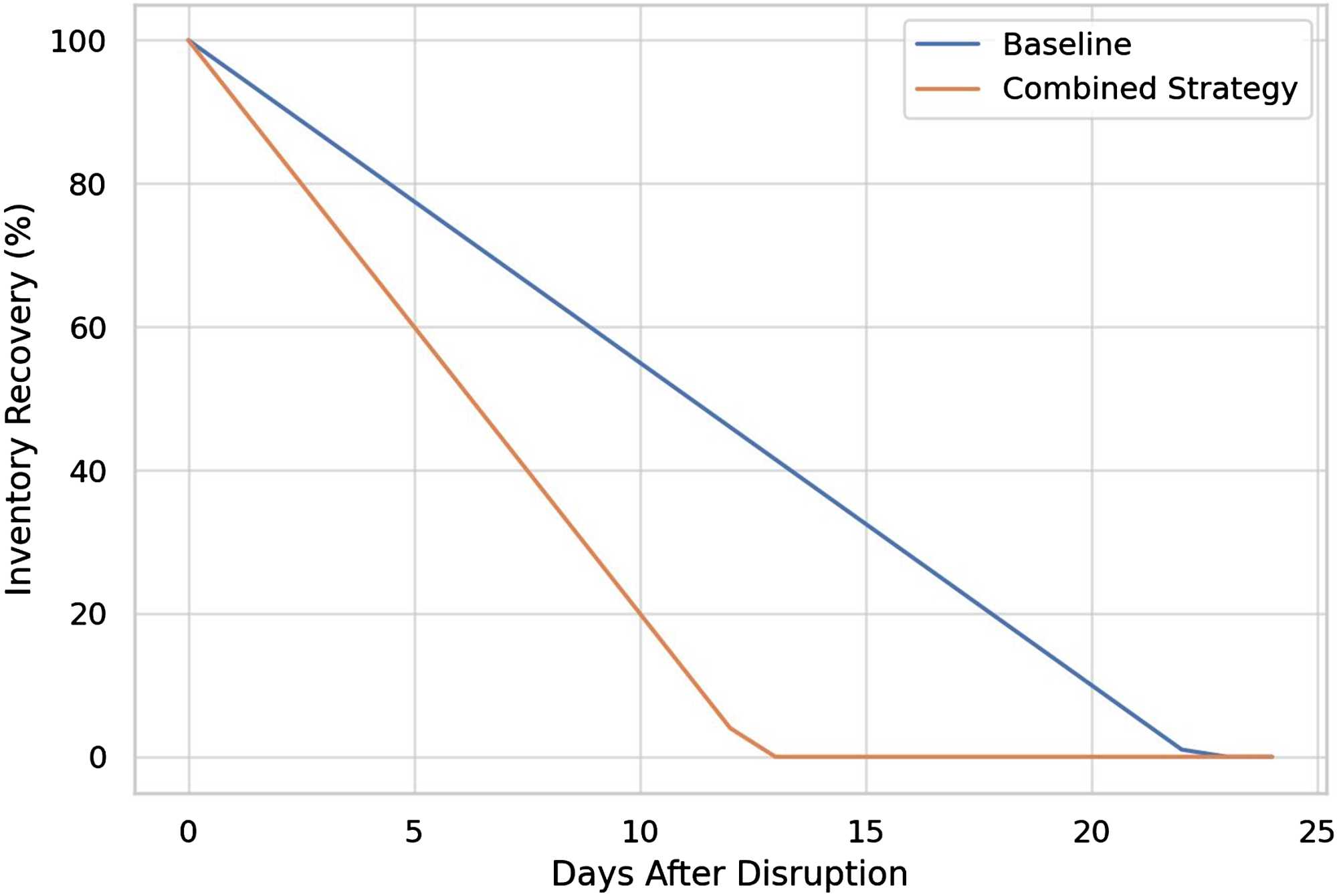 This line chart plots the time it takes for the system to return to normal stock levels after a disruption (Figure 7). The combined strategy recovers in 12 days, compared to 20+ days for others.