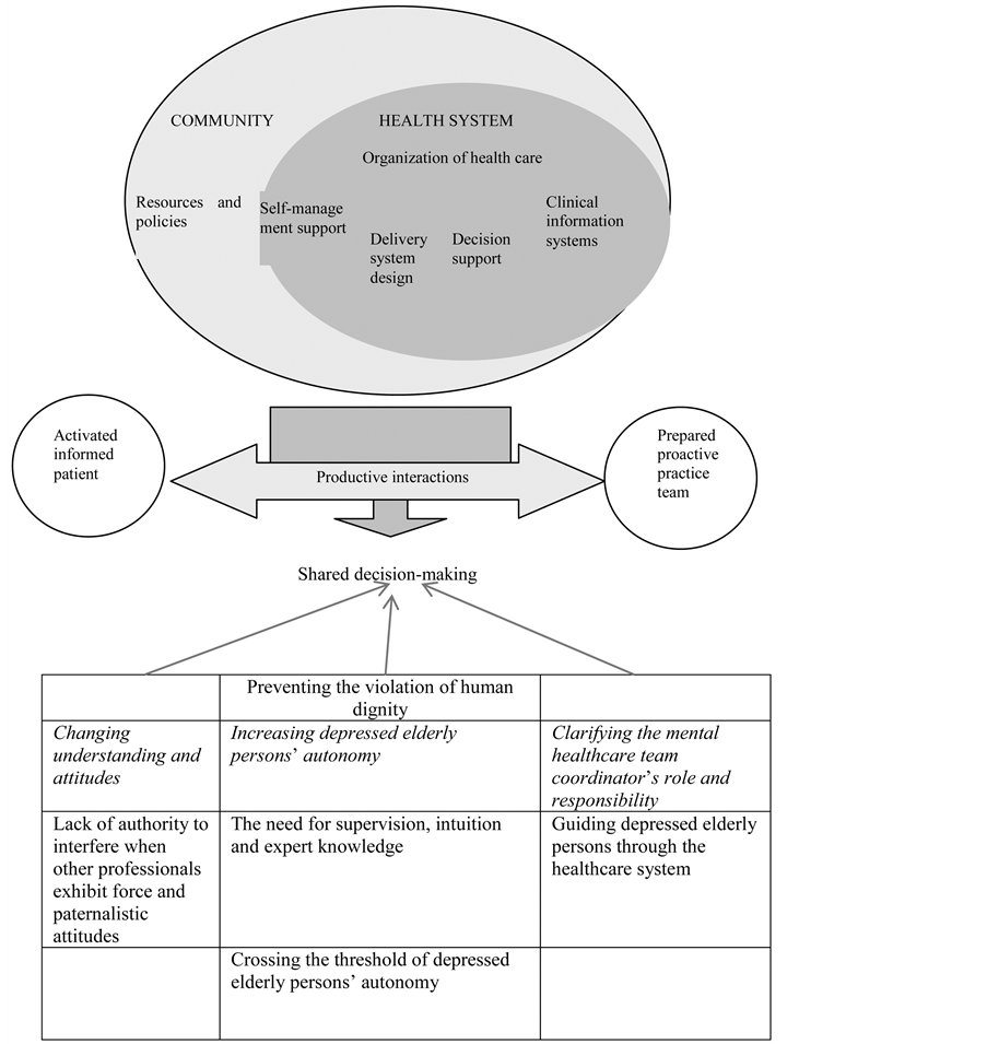 A comprehensive understanding emerged through interpretation of the overall theme “Preventing the violation of human dignity” in the light of the CCM components and the development of a proactive practice team. It was considered especially important to build a team approach for depressed elderly persons as shown in Figure 1. Thus the CCM implies shared decision-making and a team approach based on productive interaction that includes an informed and empowered patient, where the latter’s role in participation is emphasized. One aspect of the understanding was related to the lack of awareness of power strategies that are often hidden in healthcare relationships. By focusing solely on the depressed elderly person’s need to change, the interpretation also demonstrated team members’ experiences of lack of reflection on their own role in shared decision-making including failure to acknowledge the risk of forcing depressed elderly persons in a certain direction, the consequence of which can be a violation of human dignity. The depressed elderly persons’ participation in shared decision- making was mirrored by the following themes; “Changing understanding and attitudes”, “Increasing depressed elderly persons’ autonomy” and “Clarifying the mental healthcare team coordinator’s role and responsibility”.