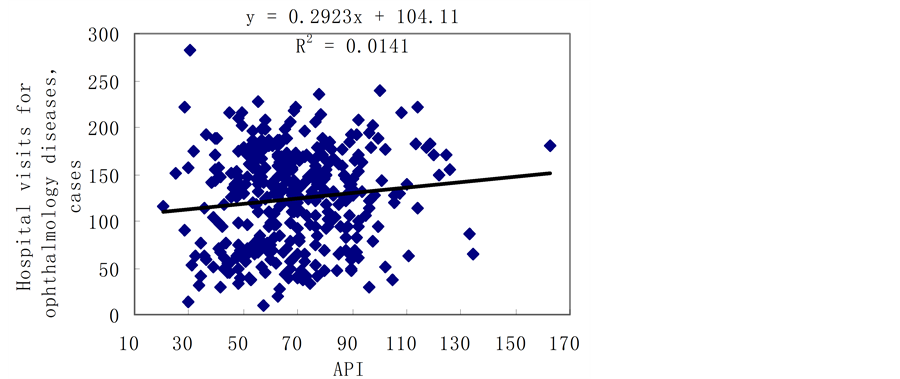 Between January 1, 2005 and December 31, 2005, the daily hospital visits of ophthalmology disease were 10 - 282 cases, the mean was 124.38 ± 51.20 cases. API’s influence on the hospital visits of ophthalmology disease and its correlation showed in Figure 3, F = 5.145, R2 = 0.0141, R = 0.12, P = 0.024 < 0.05, API was positively correlated to hospital visits of ophthalmology disease.