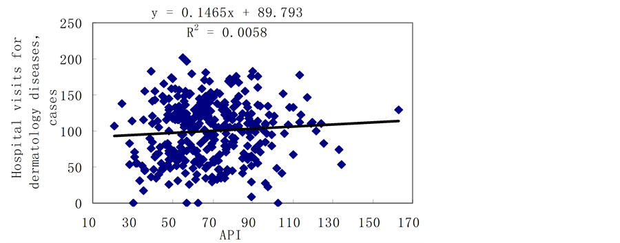 Between January 1, 2005 and December 31, 2005, the daily hospital visits of dermatology disease were 0 - 202 cases, and the mean was 99.94 ± 40.15 cases. API’s influence on the hospital visits of dermatology disease and its correlation was shown in Figure 5, F = 2.055, R2 = 0.0058, R = 0.076, P = 0.153 > 0.05, and the relationship between API and the hospital visits of dermatology disease was not evident.
