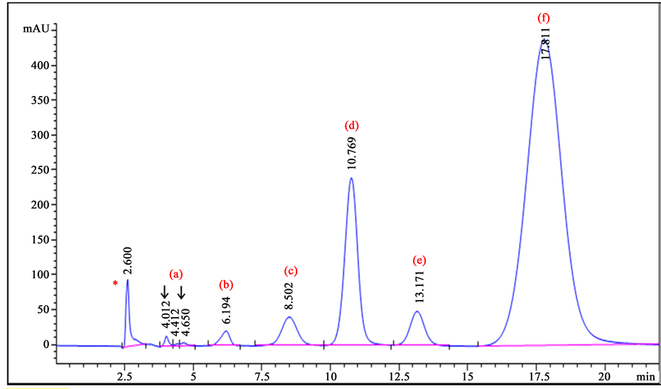 Figure 3. The chromatogram of the Reference Solution (f): (a) and (b): unknown impurities1; (c): 4-epidoxycycline; (d): metacycline HCl; (e): 6-epidoxycycline; (f): doxycycline hyclate (Note* = impurity in the blank, 1 = study to determine the impurities (a) and (b) is currently underway).