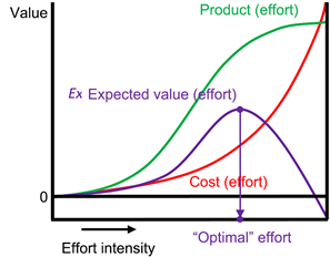 Besides, by increasing the effort intensity, the effort expected value will increase until the optimal value of effort, and will then diminished, making any ensuing effort unproductive. This diagram shows that there is a separation between the outcome of effort and its value in the real world. This diagram also shows that effort is costly and valued.