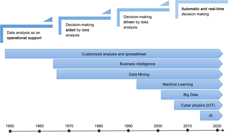 Decision support systems have evolved over time. As illustrated in Figure 17, data is the main input of decision-making approaches. From 1950, data analysis is considered as operational support for decision-making, and respectively, decision-making aided by data analysis, decision-making driven by data analysis, and finally, automatic and real-time decision-making has emerged in this digital world. Different tools for decision-making are presented as customized analysis and spreadsheets, business intelligence, data mining, and machine learning. During the 21st century, other tools like big data, cyber-physics, and artificial intelligence (AI) have also emerged to tackle digitalization.