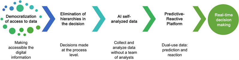 This intelligence and connectivity accelerate decision-making approaches. There is democratization to make the data and digital information accessible to anyone. Thanks to this connectivity, the hierarchies in the decision making are eliminated and the decision can be made at the process level. Artificial Intelligence creates the opportunity to analyze the data without a team analyst and the data can be used in prediction and reaction conditions. All these steps, shown in Figure 18, provide real-time decision-making approaches that make our planning faster, more precise, and more efficient [41].