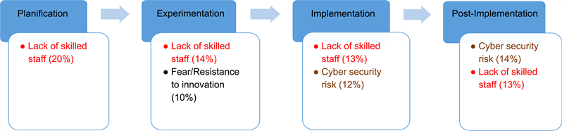 Different challenges for digital transformation are also identified through this survey. As shown in Figure 20, the top challenge in digital transformation stages including planning, experimentation, and implementation is the lack of skilled staff. Also, the cyber-security risk for the post-implementation step is the most important challenge. Other challenges like fear and resistance to change and innovation, as well as lack of leadership, etc. are other significant challenges in digital transformation.