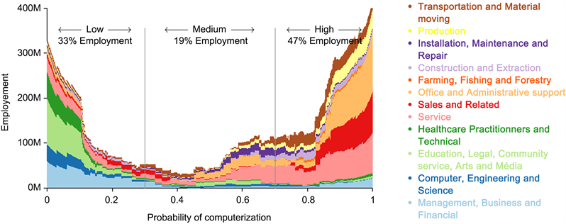 This digital transformation also affects different employment sectors. For this purpose, a study [43] investigated the effect of computerization on the numbers of employees. It examines the possible future extents at risk of jobs computerization and related labor market outcomes. As shown in Figure 21, the occupations are categorized into three levels of risk depending on their probability of computerization including low (0 - 0.3), medium (0.3 - 0.7), and high (0.7 - 1). In this figure, the vertical axis illustrates the cumulative number of jobs in the United States (in 2013) and the horizontal axis shows the probability for a job to be computerized. According to this analysis, 47 of total US employment is in the high-risk category and associated occupations are potentially automatize over some unspecified number of years, perhaps a decade or two. Therefore, these occupations are being substituted by computerized job and these occupations