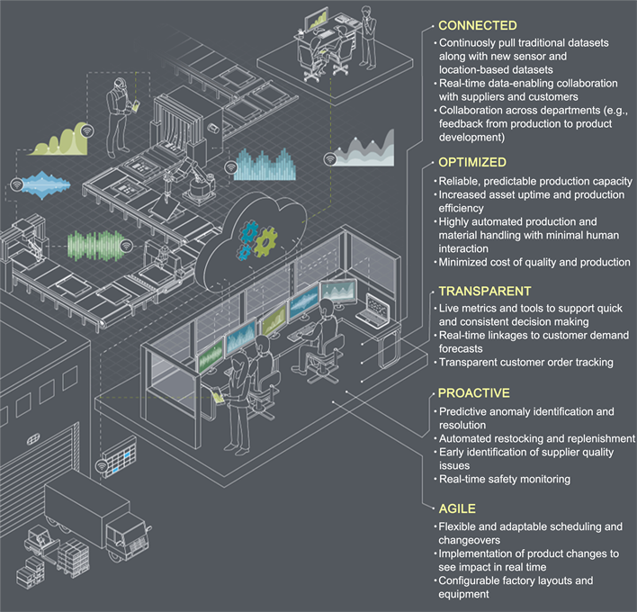 Industry 4.0 is an interconnected system, connecting machines, methods, and products. According to Deloitte Analysis [9], the five key characteristics of smart factories (as shown in Figure 4) are: