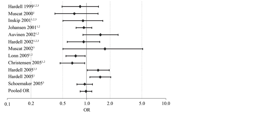 Figure 1. Pooled odds ratio of original studies and meta-analysis of mobile phone use and intracranial tumors. Studies including gliomas (1), meningiomas (2), acoustic neuromas (3).