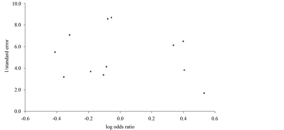 Figure 2. Funnel plot of studies included in the meta-analysis, showing no evidence of publication bias concerning intracranial tumors and mobile phone use.