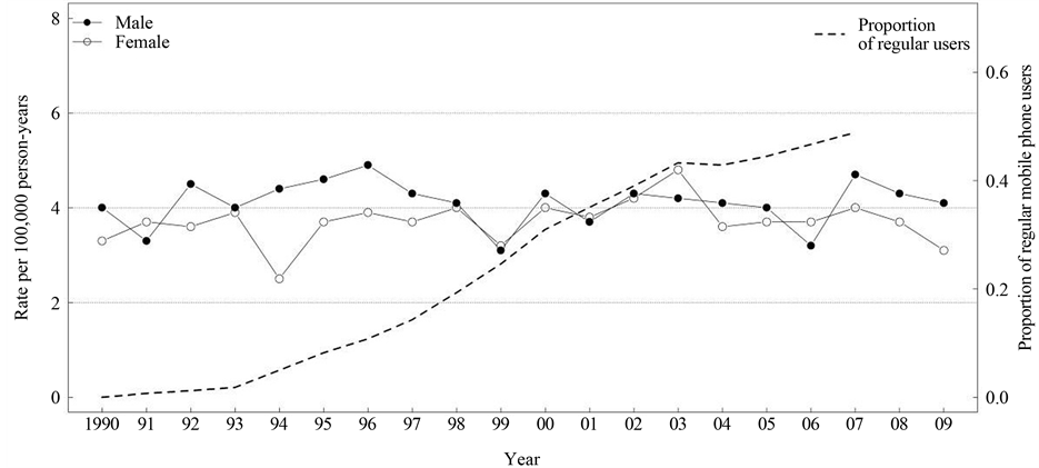Similarly, Larjavaara et al. (2011) analyzed various intracranial and body tumors and their association with mobile phone use (Figure 1) [11] . The standard incidence ratio (SIR) for brain tumors was 0.86 (95% confidence interval; CI = 0.83 to 0.90) in males, therefore showing no evidence of an increased risk for tumors of the brain.