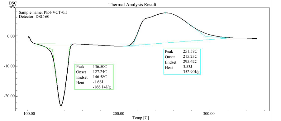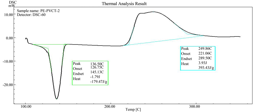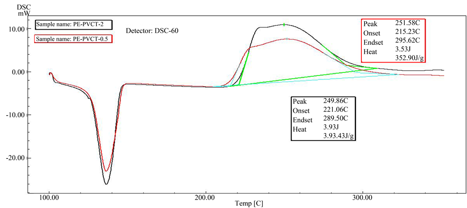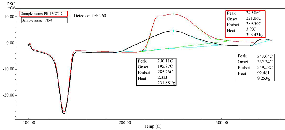 Differential Scanning Calorimetric (DSC): The DSC analysis was performed using a Shimadzu apparatus DSC-60 model, Japan. Samples of HDPE with PVC-tannin mixture (8 - 10) mg were placed in open aluminum pans under air atmosphere and the heating range between 100˚C up to 350˚C. All DSC scans were at heating rate at 10˚C/min. The melting and the oxidation temperatures of the samples can be determined.