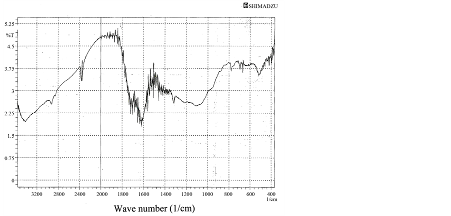 Tannins are unique and inexpensive natural polyphenolic material with antioxidant activity. They have multiple adjacent polyhydroxy phenyl groups in their chemical structure [10] -[15] . In the FTIR spectrum of tannins (Figure 1), the band which appears at 3420 cm−1 is stretch vibration absorption of O-H phenolic groups which are highly available into tannins structures. The band at 1710 cm−1 is stretch vibration absorption of C=O. This functional group is one of the main chemical groups into hydrolysable tannins, one type of tannins. Moreover, brands at 1620 cm−1, 1540 cm−1, and 1450 cm−1 are corresponded to extending vibration of C=C in benzene rings [16] .