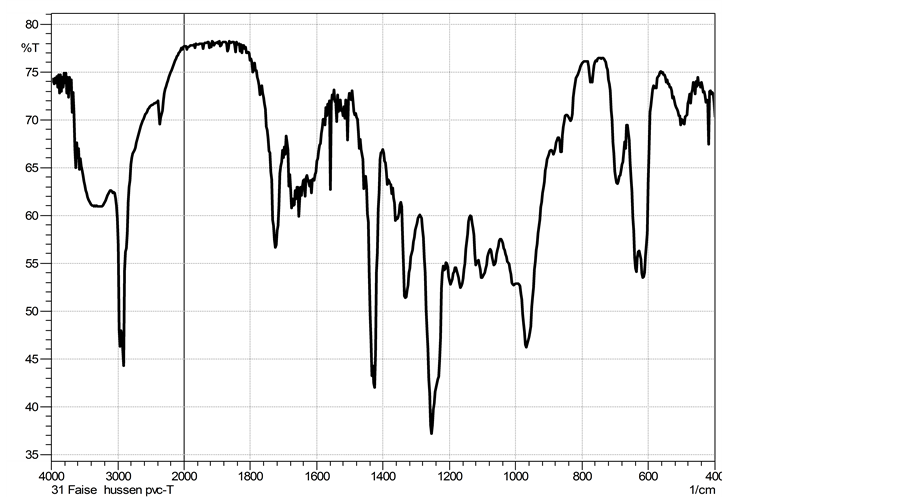 On the other hand, the variation of the chemical functional groups through the grafting of tannins onto PVC were confirmed by FTIR spectrum as shown in Figure 2 for unmodified PVC and Figure 3 for PVC after modification. The most significant changes in each spectra of the grafted PVC were the appearance of the red-shifted at (1042 - 1047) cm−1 and at 1160 cm−1 absorption bands due to the C-O stretching vibration of ethers as well as the peaks at (3200 - 3600) cm−1 which were the major characteristic peaks of hydroxyl groups of tannins and that peaks at (1600 - 1750) cm−1 representing C=C stretching bands into tannins (Figure 1 and Figure 3) [16] .