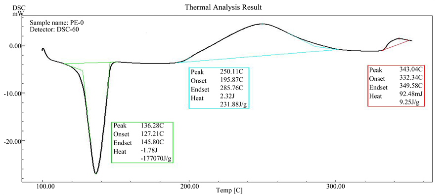 oxidation reaction of HDPE started at 195˚C. The overall shape of this exothermic peak shows a slight increase in the heat flow which continues to 285˚C. And the energy, enthalpy (ΔH) of this reaction was about 231.88 J/g, followed by maximum exothermic peak at 343˚C for thermal degradation of this polymer by causing molecular chain ruptures or scission [21] . It is apparent that the thermal degradation began to occur only after the polymer has absorbed certain amounts of the heat energy.