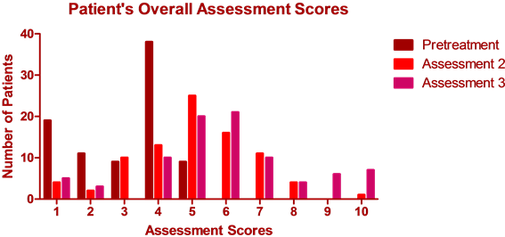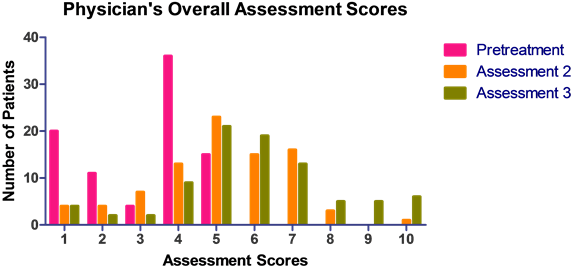 There was a statistically significant (p < 0.0001) improvement in the scores of the assessment of overall condition performed by the patients and by the study physician (Figure 4(a) and Figure 4(b)). The physician’s assessment of overall efficacy at Assessment 3 was given as “Very Good” for 12 (13.95%) patients, “Good” for 19 (22.09%) patients, “Acceptable” for 42 (48.84%), and “Poor” in 13 (15.21%) patients.