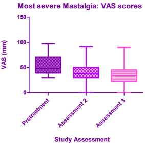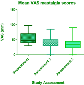 The VAS scores of the mean mastalgia and most severe mastalgia both showed statistically significant (p < 0.0001) reductions from Pretreatment to Assessment 3 (Figure 1 and Figure 2). Mean mastalgia scores improved among 92.3% of the treated patients, while most severe mastalgia scores improved among 93.4% of patients.