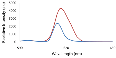 The fluorescence spectrum of 3a was measured by exiting the complex at 379 nm in solution and 307 nm in solid state. Strong emission band was observed from 600 to 630 nm. The complex 3b was exited at 379 nm in solution and 368 nm in solid state. Strong emission band was observed from 590 to 620 nm.