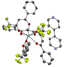In a RB flask, a solution of europium (III) chloride (0.650 g, 0.41 mmol) and 1-phenyl-4,4,4-trifluoromethyl-1,3-butanedione 1 (0.370 g, 1.65 mmol) in absolute ethanol (30 mL) was prepared at room temperature. Under protection from air, slightly excess of pyridine, bipyridine, piperazine, bipiperidine were added to the solution to get complexes 3a, 3b, 3c and 3d respectively. Ethanol was removed by rotary evaporator under reduced pressure. Under protection from air, the residue was repeatedly washed with small portions (5 mL) of warm, dry ethanol. The residual powders were dissolved in ethanol for crystallization. Without protection from air, the crystallized product was filtered off, washed with two portions of cold ethanol, and dried under reduced pressure, affording the complexes 3a, 3b, 3c and 3d as a powder. All four complexes were obtained in moderate to good yields (68% for 3a, 65% for 3b, 75% for 3c and 60% for 3d, respectively).
