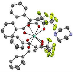 Reagent grade europium (III) chloride, pyridine, bipyridine, piperazine and bipiperidine were purchased from the TCI chemicals industry, Tokyo and used as such to prepare europium complexes. The ligand 1-phenyl-4,4,4-trifluoromethyl-1,3-butanedione was synthesized in the laboratory. The positive fast atom bombardment (FAB) mass spectrum (MS) of the complexes was obtained on a Nippon Densi JEOL JMS-SX102A spectrometer (JEOL, Tokyo, Japan) using NBA (nitrobenzyl alcohol) as the matrix and DCM (dichloromethane) as the solvent. The instrument was operated in negative ion mode over an m/z range of 100 - 2000. Elemental analysis data were recorded on a Yanako MT-4 analyzer (Yanako Group, Kyoto, Japan). A JASCO V-550 spectrophotometer (JASCO Corporation, Tokyo, Japan) was used for obtaining UV-Vis spectra in dichloromethane with 250 - 900 nm range. HITACHI F-8700 spectrophotometer (Hitachi High-Technologies Corporation, Tokyo, Japan) was used for fluorescence spectra measurements in dichloromethane with 250 - 900 nm range. CCDC No. 1962454, 2047729, 1563207 and 1563206 contain the supplementary crystallographic data for the complexes 3a, 3b, 3c and 3d, respectively.