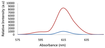 The photoluminescence properties of Lanthanide complexes with organic ligands have been greatly enhanced, and led to the development of strong luminescent Lanthanide complexes with important applications in medical, industrial and biological fields [1] - [7]. Europium (III) complex with organic ligands is an example of strong luminescent Lanthanide complex and Europium (III) complexes that have great importance in materials engineering chemistry due to significant improvement in photophysical parameters such as high luminescence emission efficiency, long fluorescence life time, large stokes shift, sharp emission bands [8] [9] [10] [11]. In the past decade various high luminescent europium complexes have been engineered and evaluated for their photoelectronic properties such as OLEDs, electroluminescent displays, bioimaging, sensing and targeting specific DNA structures, melamine detection in milk protein. Europium (III) complexes have also found applications as sensor materials to detect pesticides, temperature, HCl, NO2 gas, HOCl, pH, phosphate, mitochondria and, 8-oxo-dGTP [12] - [20]. Albumin proteins in human serum have also been detected by Europium complexes, which act as sensor materials [21].