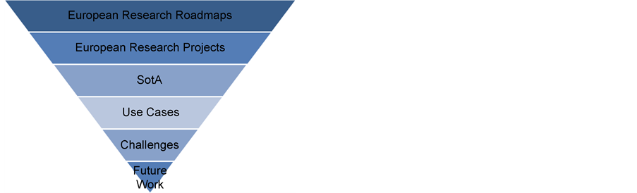 The methodology for the structure of this paper about Big Data analysis in smart manufacturing follows a top down structure as shown in Figure 1. The paper starts with an overview on European research in the addressed area (section 2.1). Analysed were selected European research roadmaps to identify research activities, challenges and aimed goals of different institutions cooperation’s or programs. Based on outcomes of this analysis were identified and analysed a range of projects (section 2.2) which are contributing to analysed research roadmaps. After the identification and analysis of related research projects is provided a State of the Art (SotA) (section 3) of research topics and technologies addressed by these roadmaps and projects. After the SotA, the paper provides a range of potential use cases and exploitation potentials (section 4) for Big Data analysis in smart manufacturing. The paper ends with open research challenges (section 5) based on gaps between SotA and Use Cases and introduces two future projects (section 6) which are partly addressing some of the identified gaps.