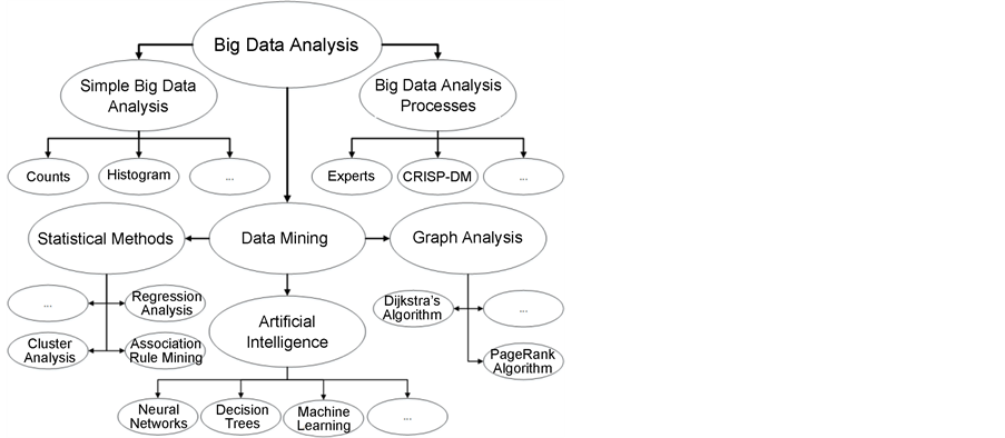 Big Data analysis is becoming an interesting topic [36] [37] and is a broad interdisciplinary research area which covers the idea to extract implicit, previously unknown, and potentially useful information from data [38] . It includes a range of sub-topics [39] , such as Big Data analysis processes (describing the process of a big data analysis in general), simple Big Data analysis mechanisms (considering the creation of histograms, counting, summarising, etc.), or Data Mining, which includes a range of methodologies for advanced analytics or knowledge extraction. Figure 6 shows a selection of such sub-topics and is the basis for the structure of this section.