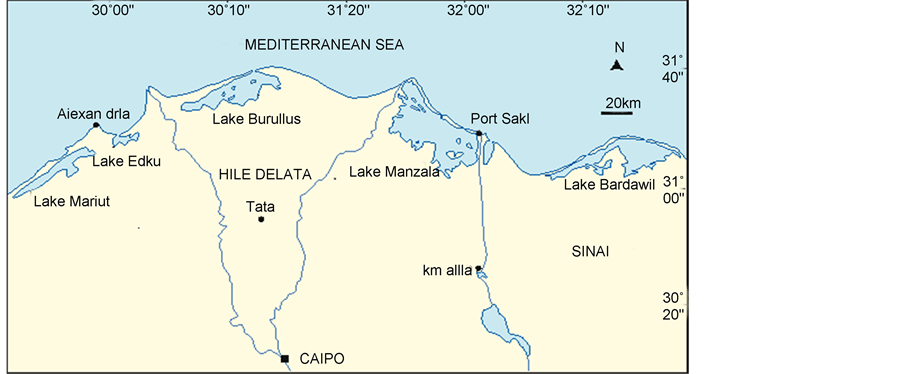 Manzala’s lagoon is the largest brackish water body of the Nile Delta coastal lakes lies between 31˚00" and 31˚30" latitude and 31˚45" and 32˚20" longitude and is shallow with depth rarely exceeding one meter with a total area ~700 km2 [7] . It occupies the north eastern corner of the Nile Delta between the Mediterranean Sea (North) and Suez Canal (East), while 5 Governorates share the western and southern Lake borders. The lake is supposed to have resulted from the accumulation of the Nile flood water, before the construction of the High Dam, in the low lying land which it occupies. It is the largest and most economically important of Egypt’s coastal lakes where it provides an abundance of fish and an internationally important wintering area for water birds and staging area for migratory birds. It has been gradually transformed from a largely marine or estuarine environment to eutrophic brackish water system. The overall area of the lake was decline from more than 1400 km2 in the early 1970s to less than 700 km2 in 2003 [8] . The Lake is considered an important and valuable natural resource ecosystem for fish catch, wildlife, hydrological and biological regime in Egypt. In the year 1979, the fish production was about 75,000 tons and the lake area was about 29,100 feddan (feddan = 0.42 hectare). Many factors, such as pollution, and drying of the many parts of the lake, have reduced the fish production significantly, to about 47,500 tons in 1990, when the lake area is19,000 feddan [9] . There are about 12,000 fisherman-representing families with a population about 50,000 people living on the islands of the lake [10] .