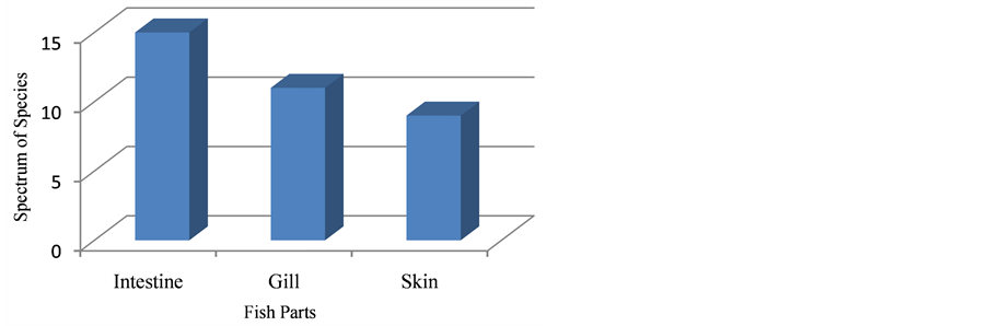 In view of spectrum of species the range of species varied among fish parts. The richness of species in intestine showed the highest spectrum by obtaining
