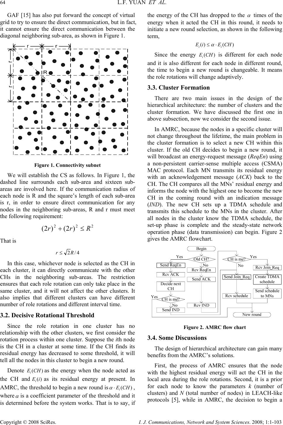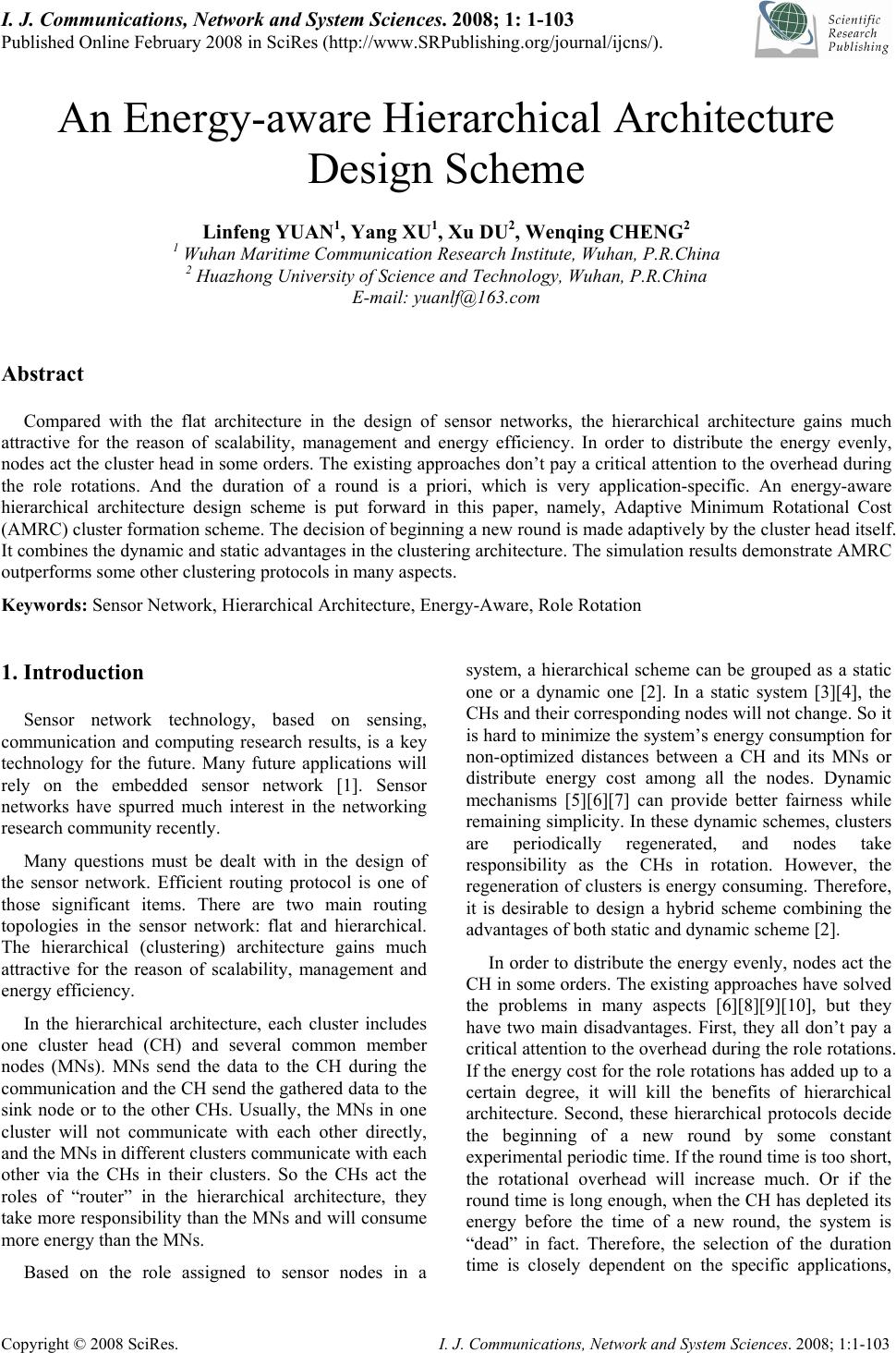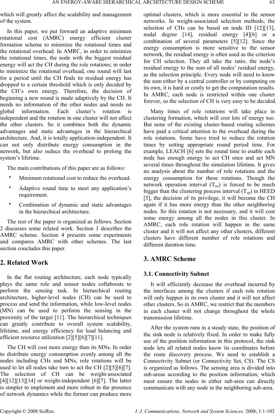 ![]() I. J. Communications, Network and System Sciences. 2008; 1: 1-103 Published Online February 2008 in SciRes (http://www.SRPublishing.org/journal/ijcns/). Copyright © 2008 SciRes. I. J. Communications, Network and System Sciences. 2008; 1:1-103 An Energy-aware Hierarchical Architecture Design Scheme Linfeng YUAN1, Yang XU1, Xu DU2, Wenqing CHENG2 1 Wuhan Maritime Communication Research Institute, Wuhan, P.R.China 2 Huazhong University of Science and Technology, Wuhan, P.R.China E-mail: yuanlf@163.com Abstract Compared with the flat architecture in the design of sensor networks, the hierarchical architecture gains much attractive for the reason of scalability, management and energy efficiency. In order to distribute the energy evenly, nodes act the cluster head in some orders. The existing approaches don’t pay a critical attention to the overhead during the role rotations. And the duration of a round is a priori, which is very application-specific. An energy-aware hierarchical architecture design scheme is put forward in this paper, namely, Adaptive Minimum Rotational Cost (AMRC) cluster formation scheme. The decision of beginning a new round is made adaptively by the cluster head itself. It combines the dynamic and static advantages in the clustering architecture. The simulation results demonstrate AMRC outperforms some other clustering protocols in many aspects. Keywords: Sensor Network, Hierarchical Architecture, Energy-Aware, Role Rotation 1. Introduction Sensor network technology, based on sensing, communication and computing research results, is a key technology for the future. Many future applications will rely on the embedded sensor network [1]. Sensor networks have spurred much interest in the networking research community recently. Many questions must be dealt with in the design of the sensor network. Efficient routing protocol is one of those significant items. There are two main routing topologies in the sensor network: flat and hierarchical. The hierarchical (clustering) architecture gains much attractive for the reason of scalability, management and energy efficiency. In the hierarchical architecture, each cluster includes one cluster head (CH) and several common member nodes (MNs). MNs send the data to the CH during the communication and the CH send the gathered data to the sink node or to the other CHs. Usually, the MNs in one cluster will not communicate with each other directly, and the MNs in different clusters communicate with each other via the CHs in their clusters. So the CHs act the roles of “router” in the hierarchical architecture, they take more responsibility than the MNs and will consume more energy than the MNs. Based on the role assigned to sensor nodes in a system, a hierarchical scheme can be grouped as a static one or a dynamic one [2]. In a static system [3][4], the CHs and their corresponding nodes will not change. So it is hard to minimize the system’s energy consumption for non-optimized distances between a CH and its MNs or distribute energy cost among all the nodes. Dynamic mechanisms [5][6][7] can provide better fairness while remaining simplicity. In these dynamic schemes, clusters are periodically regenerated, and nodes take responsibility as the CHs in rotation. However, the regeneration of clusters is energy consuming. Therefore, it is desirable to design a hybrid scheme combining the advantages of both static and dynamic scheme [2]. In order to distribute the energy evenly, nodes act the CH in some orders. The existing approaches have solved the problems in many aspects [6][8][9][10], but they have two main disadvantages. First, they all don’t pay a critical attention to the overhead during the role rotations. If the energy cost for the role rotations has added up to a certain degree, it will kill the benefits of hierarchical architecture. Second, these hierarchical protocols decide the beginning of a new round by some constant experimental periodic time. If the round time is too short, the rotational overhead will increase much. Or if the round time is long enough, when the CH has depleted its energy before the time of a new round, the system is “dead” in fact. Therefore, the selection of the duration time is closely dependent on the specific applications, ![]() AN ENERGY-AWARE HIERARCHICAL ARCHITECTURE DESIGN SCHEME 63 Copyright © 2008 SciRes. I. J. Communications, Network and System Sciences. 2008; 1:1-103 which will greatly affect the scalability and management of the system. In this paper, we put forward an adaptive minimum rotational cost (AMRC) energy efficient cluster formation scheme to minimize the rotational times and the rotational overhead. In AMRC, in order to minimize the rotational times, the node with the biggest residual energy will act the CH during the role rotations; in order to minimize the rotational overhead, one round will last for a period until the CH finds its residual energy has dropped to a certain threshold which is only decided by the CH’s own energy. Therefore, the decision of beginning a new round is made adaptively by the CH. It needs no information of the other nodes and needs no global information. Each cluster’s rotation is independent and the rotation in one cluster will not affect the other clusters. So it combines both the dynamic advantages and static advantages in the hierarchical architecture. And, it is totally application-independent. It can not only distribute energy consumption in the network, but also reduce the overhead to prolong the system’s lifetime. The main contributions of this paper are as follows: Minimum rotational cost to reduce the overhead. Adaptive round time to meet any application’s requirement. Combination of dynamic and static advantages in the hierarchical architecture. The rest of the paper is organized as follows. Section 2 discusses some related work. Section 3 describes the AMRC scheme. Section 4 presents some experiments and compares AMRC with 