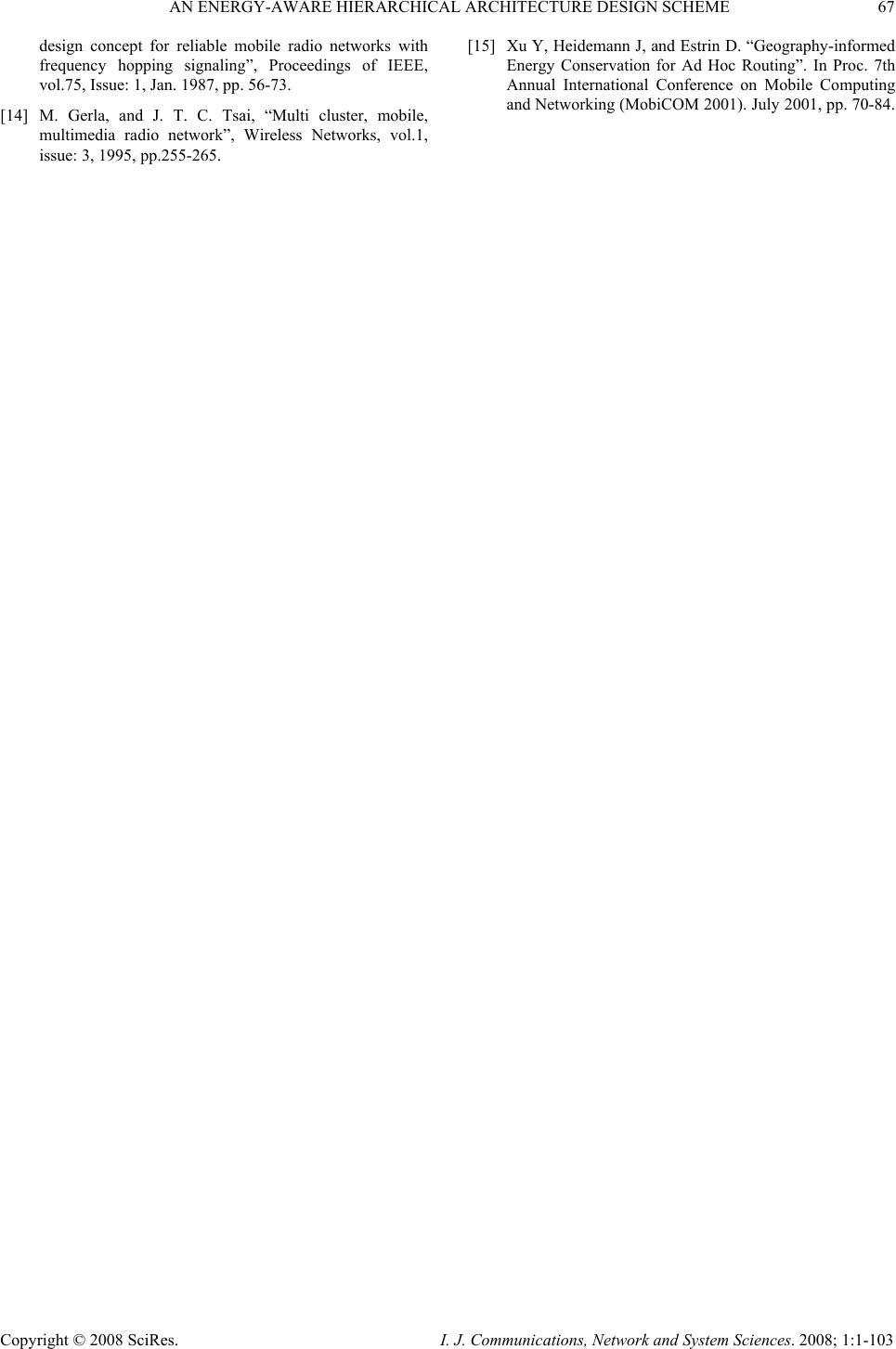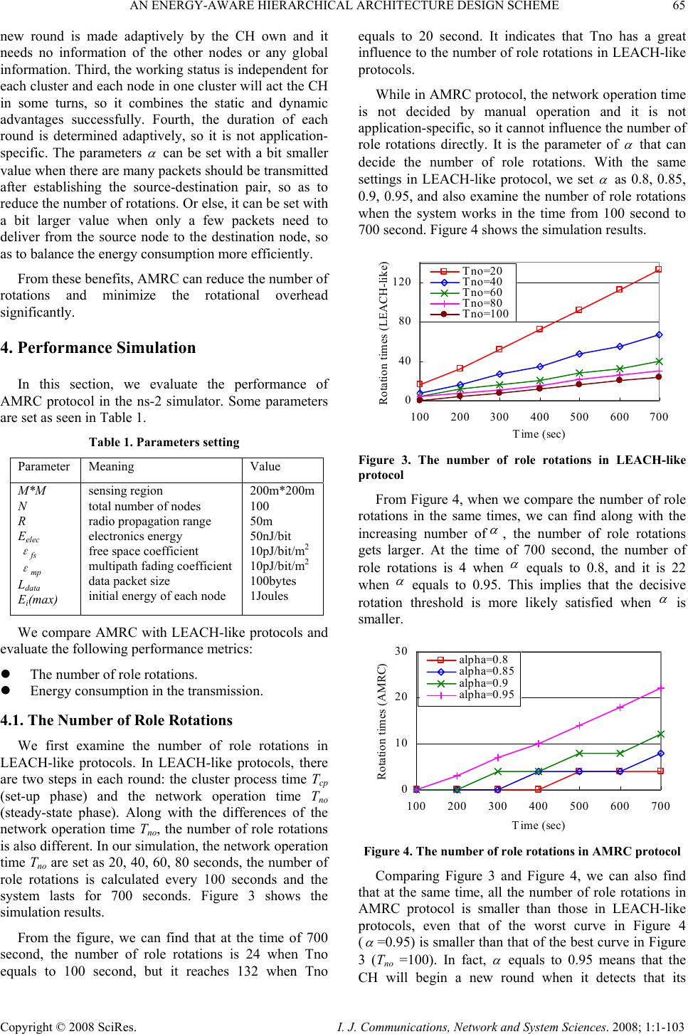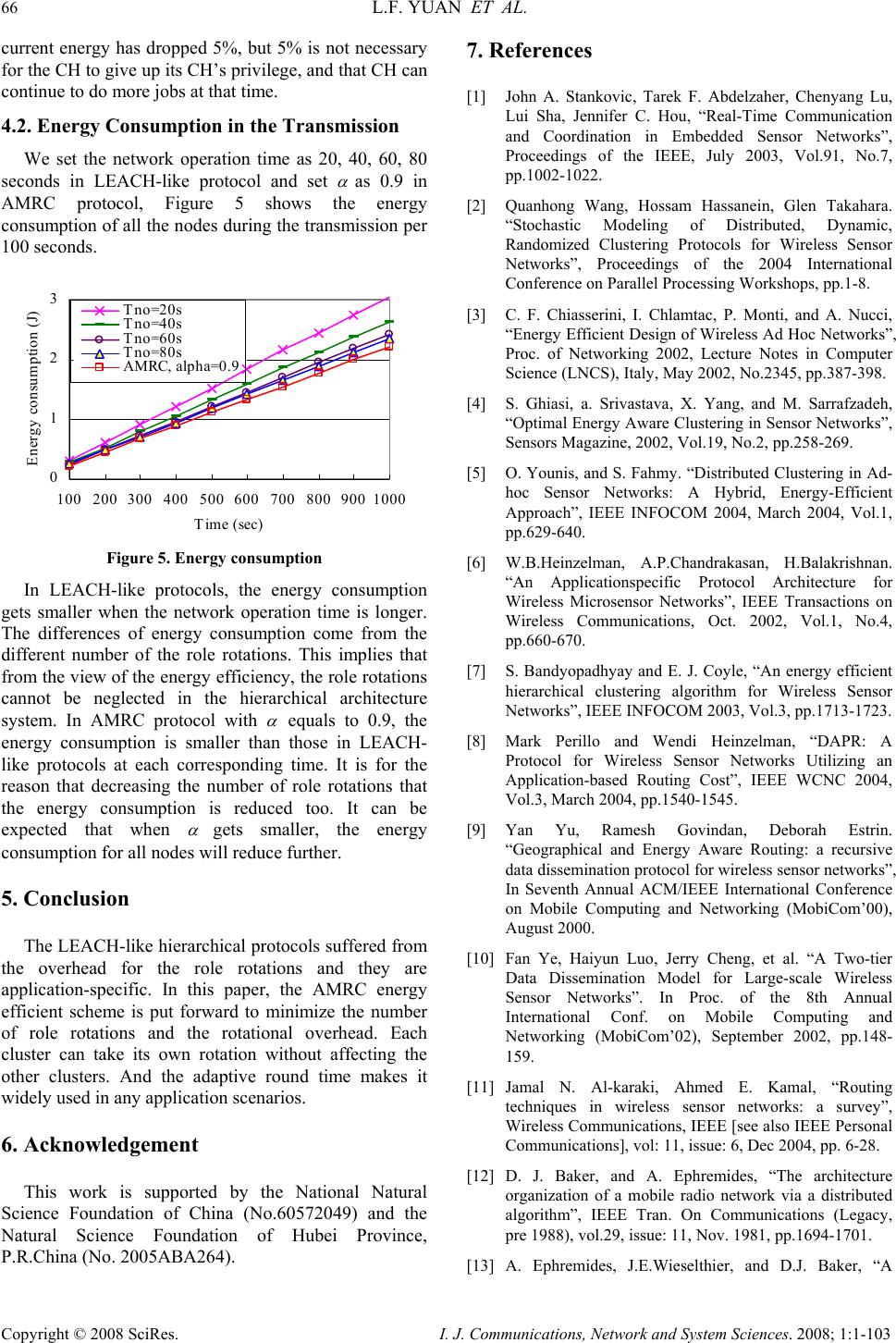 ![]() I. J. Communications, Network and System Sciences. 2008; 1: 1-103 Published Online February 2008 in SciRes (http://www.SRPublishing.org/journal/ijcns/). Copyright © 2008 SciRes. I. J. Communications, Network and System Sciences. 2008; 1:1-103 An Energy-aware Hierarchical Architecture Design Scheme Linfeng YUAN1, Yang XU1, Xu DU2, Wenqing CHENG2 1 Wuhan Maritime Communication Research Institute, Wuhan, P.R.China 2 Huazhong University of Science and Technology, Wuhan, P.R.China E-mail: yuanlf@163.com Abstract Compared with the flat architecture in the design of sensor networks, the hierarchical architecture gains much attractive for the reason of scalability, management and energy efficiency. In order to distribute the energy evenly, nodes act the cluster head in some orders. The existing approaches don’t pay a critical attention to the overhead during the role rotations. And the duration of a round is a priori, which is very application-specific. An energy-aware hierarchical architecture design scheme is put forward in this paper, namely, Adaptive Minimum Rotational Cost (AMRC) cluster formation scheme. The decision of beginning a new round is made adaptively by the cluster head itself. It combines the dynamic and static advantages in the clustering architecture. The simulation results demonstrate AMRC outperforms some other clustering protocols in many aspects. Keywords: Sensor Network, Hierarchical Architecture, Energy-Aware, Role Rotation 1. Introduction Sensor network technology, based on sensing, communication and computing research results, is a key technology for the future. Many future applications will rely on the embedded sensor network [1]. Sensor networks have spurred much interest in the networking research community recently. Many questions must be dealt with in the design of the sensor network. Efficient routing protocol is one of those significant items. There are two main routing topologies in the sensor network: flat and hierarchical. The hierarchical (clustering) architecture gains much attractive for the reason of scalability, management and energy efficiency. In the hierarchical architecture, each cluster includes one cluster head (CH) and several common member nodes (MNs). MNs send the data to the CH during the communication and the CH send the gathered data to the sink node or to the other CHs. Usually, the MNs in one cluster will not communicate with each other directly, and the MNs in different clusters communicate with each other via the CHs in their clusters. So the CHs act the roles of “router” in the hierarchical architecture, they take more responsibility than the MNs and will consume more energy than the MNs. Based on the role assigned to sensor nodes in a system, a hierarchical scheme can be grouped as a static one or a dynamic one [2]. In a static system [3][4], the CHs and their corresponding nodes will not change. So it is hard to minimize the system’s energy consumption for non-optimized distances between a CH and its MNs or distribute energy cost among all the nodes. Dynamic mechanisms [5][6][7] can provide better fairness while remaining simplicity. In these dynamic schemes, clusters are periodically regenerated, and nodes take responsibility as the CHs in rotation. However, the regeneration of clusters is energy consuming. Therefore, it is desirable to design a hybrid scheme combining the advantages of both static and dynamic scheme [2]. In order to distribute the energy evenly, nodes act the CH in some orders. The existing approaches have solved the problems in many aspects [6][8][9][10], but they have two main disadvantages. First, they all don’t pay a critical attention to the overhead during the role rotations. If the energy cost for the role rotations has added up to a certain degree, it will kill the benefits of hierarchical architecture. Second, these hierarchical protocols decide the beginning of a new round by some constant experimental periodic time. If the round time is too short, the rotational overhead will increase much. Or if the round time is long enough, when the CH has depleted its energy before the time of a new round, the system is “dead” in fact. Therefore, the selection of the duration time is closely dependent on the specific applications, ![]() AN ENERGY-AWARE HIERARCHICAL ARCHITECTURE DESIGN SCHEME 63 Copyright © 2008 SciRes. I. J. Communications, Network and System Sciences. 2008; 1:1-103 which will greatly affect the scalability and management of the system. In this paper, we put forward an adaptive minimum rotational cost (AMRC) energy efficient cluster formation scheme to minimize the rotational times and the rotational overhead. In AMRC, in order to minimize the rotational times, the node with the biggest residual energy will act the CH during the role rotations; in order to minimize the rotational overhead, one round will last for a period until the CH finds its residual energy has dropped to a certain threshold which is only decided by the CH’s own energy. Therefore, the decision of beginning a new round is made adaptively by the CH. It needs no information of the other nodes and needs no global information. Each cluster’s rotation is independent and the rotation in one cluster will not affect the other clusters. So it combines both the dynamic advantages and static advantages in the hierarchical architecture. And, it is totally application-independent. It can not only distribute energy consumption in the network, but also reduce the overhead to prolong the system’s lifetime. The main contributions of this paper are as follows: Minimum rotational cost to reduce the overhead. Adaptive round time to meet any application’s requirement. Combination of dynamic and static advantages in the hierarchical architecture. The rest of the paper is organized as follows. Section 2 discusses some related work. Section 3 describes the AMRC scheme. Section 4 presents some experiments and compares AMRC with 