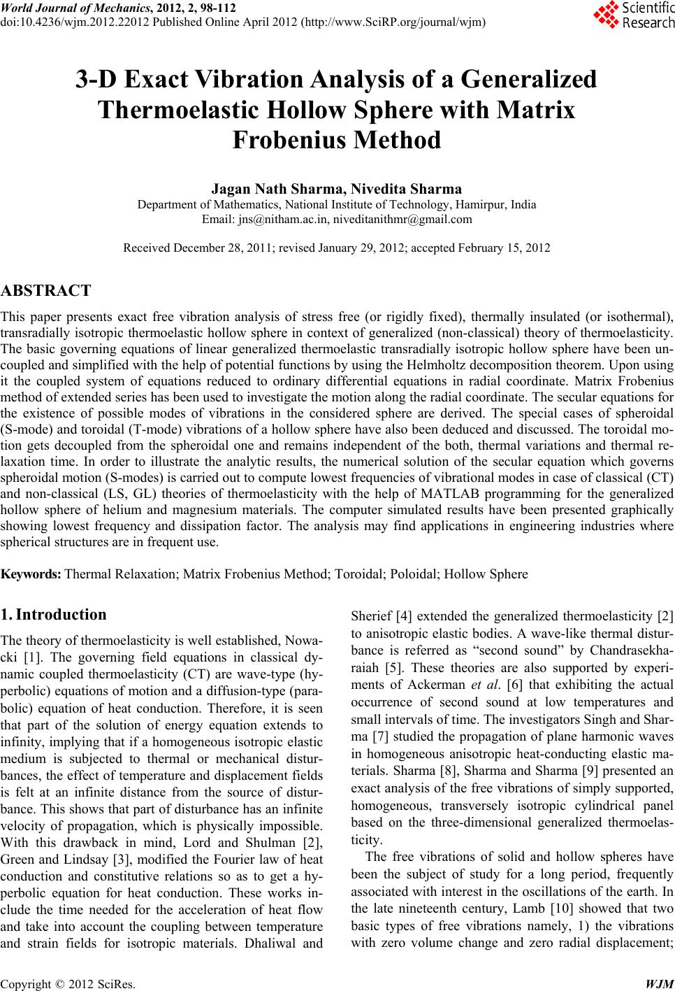 World Journal of Mechanics, 2012, 2, 98-112 doi:10.4236/wjm.2012.22012 Published Online April 2012 (http://www.SciRP.org/journal/wjm) 3-D Exact Vibration Analysis of a Generalized Thermoelastic Hollow Sphere with Matrix Frobenius Method Jagan Nath Sharma, Nivedita Sharma Department of Mathematics, National Institute of Technology, Hamirpur, India Email: jns@nitham.ac.in, niveditanithmr@gmail.com Received December 28, 2011; revised January 29, 2012; accepted February 15, 2012 ABSTRACT This paper presents exact free vibration analysis of stress free (or rigidly fixed), thermally insulated (or isothermal), transradially isotropic thermoelastic hollow sphere in context of generalized (non-classical) theory of thermoelasticity. The basic governing equations of linear generalized thermoelastic transradially isotropic hollow sphere have been un- coupled and simplified with the help of potential functions by using the Helmholtz decomposition theorem. Upon using it the coupled system of equations reduced to ordinary differential equations in radial coordinate. Matrix Frobenius method of extended series has been used to investigate the motion along the radial coordinate. The secular equations for the existence of possible modes of vibrations in the considered sphere are derived. The special cases of spheroidal (S-mode) and toroidal (T-mode) vibrations of a hollow sphere have also been deduced and discussed. The toroidal mo- tion gets decoupled from the spheroidal one and remains independent of the both, thermal variations and thermal re- laxation time. In order to illustrate the analytic results, the numerical solution of the secular equation which governs spheroidal motion (S-modes) is carried out to compute lowest frequencies of vibrational modes in case of classical (CT) and non-classical (LS, GL) theories of thermoelasticity with the help of MATLAB programming for the generalized hollow sphere of helium and magnesium materials. The computer simulated results have been presented graphically showing lowest frequency and dissipation factor. The analysis may find applications in engineering industries where spherical structures are in frequent use. Keywords: Thermal Relaxation; Matrix Frobenius Method; Toroidal; Poloidal; Hollow Sphere 1. Introduction The theory of thermoelasticity is well established, Nowa- cki [1]. The governing field equations in classical dy- namic coupled thermoelasticity (CT) are wave-type (hy- perbolic) equations of motion and a diffusion-type (para- bolic) equation of heat conduction. Therefore, it is seen that part of the solution of energy equation extends to infinity, implying that if a homogeneous isotropic elastic medium is subjected to thermal or mechanical distur- bances, the effect of temperature and displacement fields is felt at an infinite distance from the source of distur- bance. This shows that part of disturbance has an infinite velocity of propagation, which is physically impossible. With this drawback in mind, Lord and Shulman [2], Green and Lindsay [3], modified the Fourier law of heat conduction and constitutive relations so as to get a hy- perbolic equation for heat conduction. These works in- clude the time needed for the acceleration of heat flow and take into account the coupling between temperature and strain fields for isotropic materials. Dhaliwal and Sherief [4] extended the generalized thermoelasticity [2] to anisotropic elastic bodies. A wave-like thermal distur- bance is referred as “second sound” by Chandrasekha- raiah [5]. These theories are also supported by experi- ments of Ackerman et al. [6] that exhibiting the actual occurrence of second sound at low temperatures and small intervals of time. The investigators Singh and Shar- ma [7] studied the propagation of plane harmonic waves in homogeneous anisotropic heat-conducting elastic ma- terials. Sharma [8], Sharma and Sharma [9] presented an exact analysis of the free vibrations of simply supported, homogeneous, transversely isotropic cylindrical panel based on the three-dimensional generalized thermoelas- ticity. The free vibrations of solid and hollow spheres have been the subject of study for a long period, frequently associated with interest in the oscillations of the earth. In the late nineteenth century, Lamb [10] showed that two basic types of free vibrations namely, 1) the vibrations with zero volume change and zero radial displacement; Copyright © 2012 SciRes. WJM