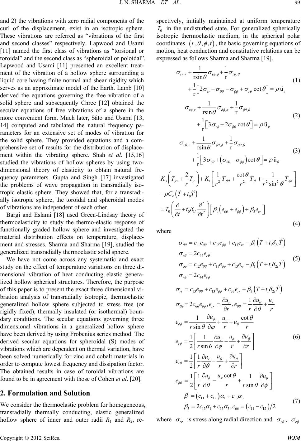 J. N. SHARMA ET AL. 99 and 2) the vibrations with zero radial components of the curl of the displacement, exist in an isotropic sphere. These vibrations are referred as “vibrations of the first and second classes” respectively. Lapwood and Usami [11] named the first class of vibrations as “torsional or toroidal” and the second class as “spheroidal or poloidal”. Lapwood and Usami [11] presented an excellent treat- ment of the vibration of a hollow sphere surrounding a liquid core having finite normal and shear rigidity which serves as an approximate model of the Earth. Lamb [10] derived the equations governing the free vibration of a solid sphere and subsequently Chree [12] obtained the secular equations of free vibrations of a sphere in the more convenient form. Much later, Sâto and Usami [13, 14] computed and tabulated the natural frequency pa- rameters for an extensive set of modes of vibration for the solid sphere. They provided equations and a com- prehensive set of results for the distribution of displace- ment within the vibrating sphere. Shah et al. [15,16] studied the vibrations of hollow spheres by using two- dimensional theory of elasticity to obtain natural fre- quency parameters. Gupta and Singh [17] investigated the problems of wave propagation in transradially iso- tropic elastic sphere. They showed that, for a transradi- ally isotropic sphere, the toroidal and spheroidal modes of vibrations are independent of each other. Bargi and Eslami [18] used Green-Lindsay theory of thermoelasticity to study the thermo-elastic response of functionally graded hollow sphere and investigated the material distribution effects on temperature, displace- ment and stresses. Sharma and Sharma [19], studied the generalized transradially thermoelastic solid sphere. We have not come across any systematic and exact study on the effect of temperature variations on three di- mensional vibration of heat conducting elastic genera- lized hollow spherical structures. Therefore, the purpose of this paper is to present the exact three dimensional vi- bration analysis of transradially isotropic, thermoelastic generalized hollow sphere subjected to stress free (or rigidly fixed), thermally insulated (or isothermal) boun- dary conditions. The secular equations governing three dimensional vibrations in a generalized hollow sphere have been derived by using Frobenius series method. The derived secular equations for spheroidal (S) modes of vibrations which are dependent on thermal variation, have been solved numerically for zinc and cobalt materials in order to compute lowest frequency and dissipation factor. The obtained results in case of toroidal vibrations are found to be in agreement with those of Cohen et al. [20]. 2. Formulation and Solution We consider the thermoelastic problem for homogeneous, transradially thermally conducting, elastic generalized hollow sphere of inner and outer radii R 1 and R2, re- spectively, initially maintained at uniform temperature 0 in the undisturbed state. For generalized spherically isotropic thermoelastic medium, in the spherical polar coordinates T ,,,rt , the basic governing equations of motion, heat conduction and constitutive relations can be expressed as follows Sharma and Sharma [19]. ,r,r, r 11 rsin r 12cot r rr r rr r u (1) ,,, 11 rsin r 132cot r rr r u (2) ,,, 11 rsin r 13cot r rr r u (3) 3,,1 ,,, 2222 0 2 001 13 2 21cot1 sin rr r e lrr KTT KTTT rrrr CTtT Tt eee tt (4) where 11121311 2 44 12111311 2 44 2 2 rr l rr rr l rr cececeTtT ce cececeTtT ce (5) 131333312 66 1 2, , 1cot sin 11 2sin 11 2 cot 11 1 2sin rrrr l rr rr r r r r r cececeTtT u uu ce ee rrr uu eu rrr uu u errr uu u errr uu u errr (6) 111121133 3131333661112 2, cc c ccccc 2 (7) where rr is stress along radial direction and r , r Copyright © 2012 SciRes. WJM