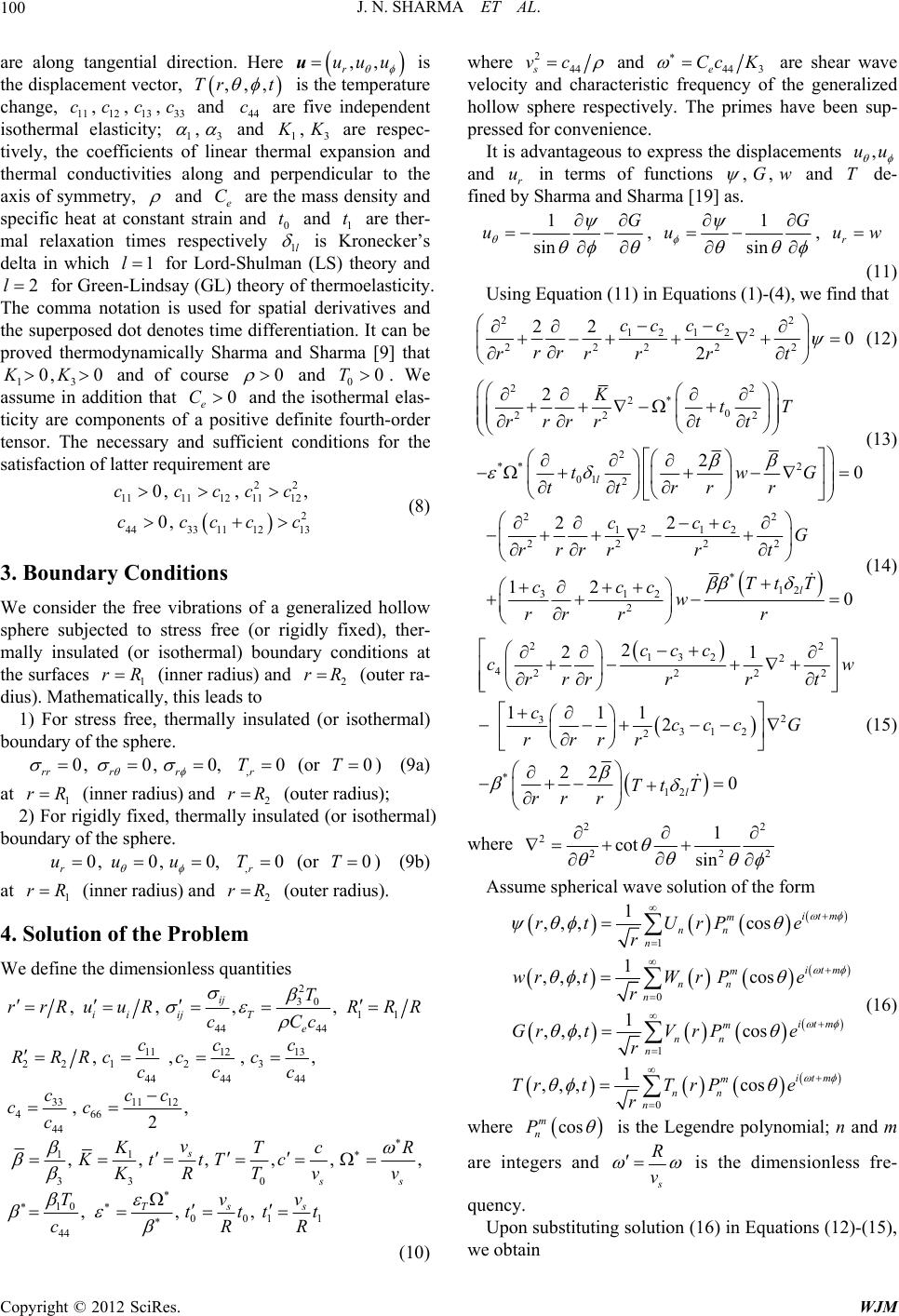 J. N. SHARMA ET AL. 100 are along tangential direction. Here ,, r uuu u is the displacement vector, is the temperature change, 11 1213 and 44 are five independent isothermal elasticity; 13 ,,,Tr t c , 33 ,,,cccc and 13 , K are respec- tively, the coefficients of linear thermal expansion and thermal conductivities along and perpendicular to the axis of symmetry, and e C are the mass density and specific heat at constant strain and and 1 are ther- mal relaxation times respectively 1l 0 t t is Kronecker’s delta in which for Lord-Shulman (LS) theory and for Green-Lindsay (GL) theory of thermoelasticity. The comma notation is used for spatial derivatives and the superposed dot denotes time differentiation. It can be proved thermodynamically Sharma and Sharma [9] that 13 and of course 1l 0K 2l 0,K0 0 e C 12 11 33 1112 ,cc cc 0, and 0. We assume in addition that and the isothermal elas- ticity are components of a positive definite fourth-order tensor. The necessary and sufficient conditions for the satisfaction of latter requirement are 0T 22 12 2 13 ,c c 2 rR 11 11 44 0, 0, cc cc rR 0, 0, r r (8) 3. Boundary Conditions We consider the free vibrations of a generalized hollow sphere subjected to stress free (or rigidly fixed), ther- mally insulated (or isothermal) boundary conditions at the surfaces 1 (inner radius) and (outer ra- dius). Mathematically, this leads to 1) For stress free, thermally insulated (or isothermal) boundary of the sphere. rr R 0, 0, r uu 1 R ,0 r T R 0,u ,0 r T 2 rR (or ) (9a) 0T 0T at (inner radius) and r (outer radius); 1 2 2) For rigidly fixed, thermally insulated (or isothermal) boundary of the sphere. r r (or ) (9b) at (inner radius) and (outer radius). 4. Solution of the Problem We define the dimensionless quantities 2 30 11 44 13 12 22 123 44 44 33 11 12 466 44 11 33 0 10 1 44 , , , ,, ,,,, , ,,, ij ii ij e s ss ss T rrRuu RRR cC c cc RRRc c ccc c cc c v KTc R c 44 11 44 ,, ,, 2 T R cc Kt 00 , T c tT 1 , c RT tt v t v Tvv t cRR (10) where 2 44s vc and 44 3e Cc K are shear wave velocity and characteristic frequency of the generalized hollow sphere respectively. The primes have been sup- pressed for convenience. It is advantageous to express the displacements ,uu and r in terms of functions u,,Gw and de- fined by Sharma and Sharma [19] as. T 1 sin G u , 1 sin G u , r uw (11) Using Equation (11) in Equations (1)-(4), we find that 22 2 12 12 22222 22 0 2 cc cc rr rrrrt (12) 22 2* 0 22 2 2 ** 2 01 2 2 20 l KtT rr t rr t tw trrr t G (13) 22 2 112 2222 * 12 312 2 2 2 120 l ccc G rr rrrt Tt T cccw rr r r (14) 22 132 2 4222 2 3 312 2 * 12 2 21 111 2 22 0 l ccc cw rr rrr cccc G rrr r Tt T rr r 2 t (15) where 22 2 22 1 cot sin 2 Assume spherical wave solution of the form 1 0 1 0 1 ,,, cos 1 ,,, cos 1 ,,, cos 1 ,,, cos itm m nn n itm m nn n itm m nn n itm m nn n rtUrP e r wrtWrPe r GrtV rPe r TrtT rPe r (16) where cos m n P is the Legendre polynomial; n and m are integers and s R v is the dimensionless fre- quency. Upon substituting solution (16) in Equations (12)-(15), we obtain Copyright © 2012 SciRes. WJM