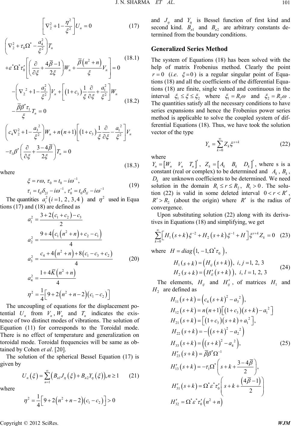 J. N. SHARMA ET AL. 101 2 2 22 1 n U 0 (17) 2 2* 4 20 2 2 ** 0 41 0 2 n nn aT nn WV (18.1) 2 22 23 2 * 1 1 11 0 nn n a Vc T 2 1 2 a W (18.2) 22 231 42 3 22 * 1 1 111 34 0 2 nn n aa cWnnc T V 1 (18.3) where 1 00 1 102 001 ,, , ll rti ti ti 22 (19) The quantities and 1,2, 3,4 i ai used in Equa tions (17) and (18) are defined as 12 3 2 1 2 121 2 2 2 41 2 3 2 2 4 22 12 32 2 94 4 48 4 14 4 192 2 4 ccc a cnn c c a cnnccc a Knn a nn cc 32 1 (20) The uncoupling of equations for the displacement po- tential n from n and n indicates the exis- tence of two distinct modes of vibrations. The solution of Equation (11) for corresponds to the Toroidal mode. There is no effect of temperature and generalization on toroidal mode. Toroidal frequencies will be same as ob- tained by Cohen et al. [20]. U, n VW T The solution of the spherical Bessel Equation (17) is given by 12 1 , nn n n BJ BY Un (21) where 22 12 19220 4nncc and and Y is Bessel function of first kind and second kind. 1n and 2n are arbitrary constants de- termined from the boundary conditions. B B Generalized Series Method The system of Equations (18) has been solved with the help of matrix Frobenius method. Clearly the point 0r (i.e. 0 ) is a regular singular point of Equa- tions (18) and all the coefficients of the differential Equa- tions (18) are finite, single valued and continuous in the interval 12 where 11 R and 22 R . The quantities satisfy all the necessary conditions to have series expansions and hence the Frobenius power series method is applicable to solve the coupled system of dif- ferential Equations (18). Thus, we have took the solution vector of the type 0 k nk k YZ (22) where nnnn YWVT , kkkk ABD , where s is a constant (real or complex) to be determined and , kk B rR , k are unknown coefficients to be determined. We need solution in the domain 12 , 1. The solu- tion (22) is valid in some deleted interval D RrR R0 0 , 2 RR (about the origin) where is the radius of convergence. R Upon substituting solution (22) along with its deriva- tives in Equations (18) and simplifying, we get 21 12 0 0 sk k k HskH skHZ (23) where * 0 1, 1,Hdiag , 1 2 ,, 1,2,3 , ,1,2,3 ij il HHskij sk HHskil sk (24) The elements, ij and ij , of matrices 1 and 2 are defined as 22 11 43 2 123 1 2 213 1 22 22 2 22 33 4 *1 23 * 13 1 ** 31 0 ** 2 32 0 , 11 1, , 34 , 2 41 2 Hskcsk a sknnc ska Hsk cska Hsksk a Hsksk a Hsk Hsk sk Hsk sk Hnn (25) Copyright © 2012 SciRes. WJM