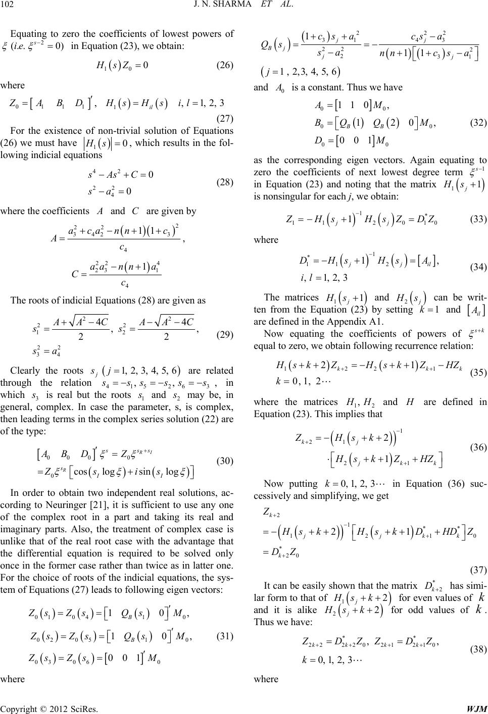 J. N. SHARMA ET AL. 102 Equating to zero the coefficients of lowest powers of in Equation (23), we obtain: 2 (.. 0) s ie 10 0HsZ (26) where 0111 ABD , 1,1,2, il HsH sil3 (27) For the existence of non-trivial solution of Equations (26) we must have 10Hs, which results in the fol- lowing indicial equations 42 22 4 0 0 sAsC sa (28) where the coefficients and C are given by 2 22 342 3 4 11acann c Ac , 22 4 23 1 4 1aanna Cc The roots of indicial Equations (28) are given as 22 22 12 22 34 4 , 22 4 , ACAAC ss sa (29) Clearly the roots j are related through the relation 415263 1, 2,3, 4,5, 6 sj ,, ss ss s, in which 3 is real but the roots 1 and 2 may be, in general, complex. In case the parameter, s, is complex, then leading terms in the complex series solution (22) are of the type: 00 00 0coslogsin log RI R ss s s II ABD Z Zsis (30) In order to obtain two independent real solutions, ac- cording to Neuringer [21], it is sufficient to use any one of the complex root in a part and taking its real and imaginary parts. Also, the treatment of complex case is unlike that of the real root case with the advantage that the differential equation is required to be solved only once in the former case rather than twice as in latter one. For the choice of roots of the indicial equations, the sys- tem of Equations (27) leads to following eigen vectors: 01 0410 02 0510 03 060 10 10 001 B B Zs ZsQsM Zs ZsQsM Zs ZsM , , (31) where 222 31 43 22 2 231 1 11 1, 2,3, 4,5,6 jj Bj jj cs acsa Qs sa nnc sa j and 0 is a constant. Thus we have 00 00 00 110 , 120 001 BB AM BQ QM DM , (32) as the corresponding eigen vectors. Again equating to zero the coefficients of next lowest degree term 1 in Equation (23) and noting that the matrix 1 j1 Hs is nonsingular for each j, we obtain: 1* 11 201 1 jj 0 HsHsZDZ (33) where 1 * 11 2 1, ,1,2,3 jj DHsHsA il il (34) The matrices 11 j Hs and 2 s k can be writ- ten from the Equation (23) by setting and 1 il are defined in the Appendix A1. Now equating the coefficients of powers of k equal to zero, we obtain following recurrence relation: 1221 21 0,1,2 kkk skZHsk ZHZ k (35) where the matrices 12 , H and are defined in Equation (23). This implies that 1 21 21 2 1 kj kk ZHsk sk ZHZ (36) Now putting 0,1,2,3k in Equation (36) suc- cessively and simplifying, we get 2 1** 121 * 20 21 k jjk k Z 0k skHsk DHDZ DZ (37) It can be easily shown that the matrix has simi- lar form to that of * 2k D 12 j Hsk for even values of and it is alike k 22 j Hs k for odd values of k. Thus we have: ** 22220 21210 ,, 0, 1,2,3 kk kk ZDZZDZ k (38) where Copyright © 2012 SciRes. WJM