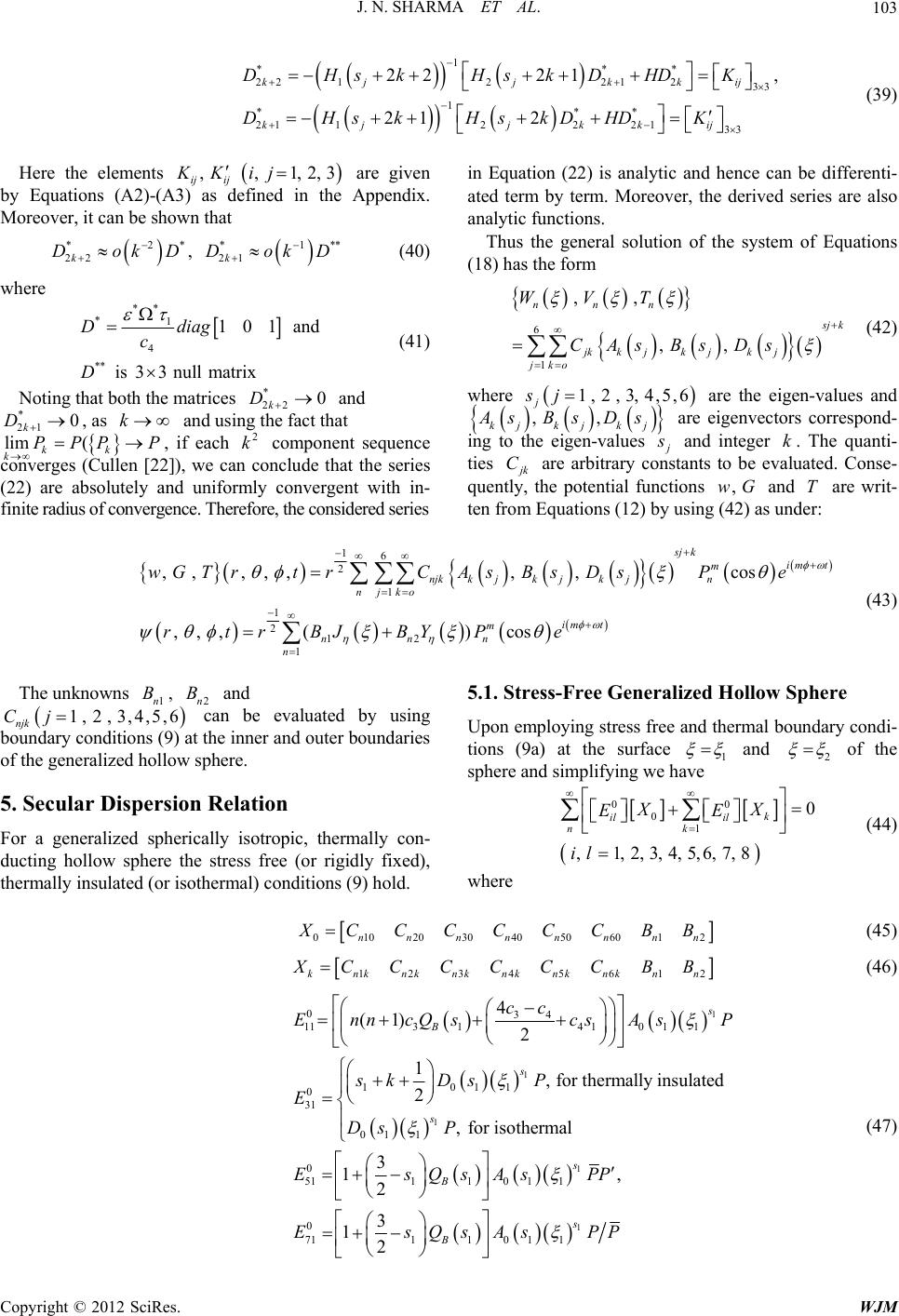 J. N. SHARMA ET AL. Copyright © 2012 SciRes. WJM 103 * * , j 3 ** 1 ** 221221 233 1 ** 21122 2133 22 21 21 2 kj jkki kj jkkij DHskHskDHDK DHskHskDHDK (39) Here the elements are given by Equations (A2)-(A3) as defined in the Appendix. Moreover, it can be shown that ,,1,2, ij ij KK ij in Equation (22) is analytic and hence can be differenti- ated term by term. Moreover, the derived series are also analytic functions. Thus the general solution of the system of Equations (18) has the form *2 22k Dok * D *1 21k DokD , (40) where 6 1 ,, ,, nnn jk jk kjkjkj jko WVT CAsBsDs (42) ** *1 4 ** 101and is33 null matrix Ddiag c D (41) where 1,2,3,4,5,6 j sj are the eigen-values and ,, kjkj kj sBsDs are eigenvectors correspond- ing to the eigen-values and integer . The quanti- ties k k are arbitrary constants to be evaluated. Conse- quently, the potential functions and T are writ- ten from Equations (12) by using (42) as under: C ,wG Noting that both the matrices and * 22 0 k D * 21 0 k D lim ( k PP , as and using the fact that k k , if each component sequence converges (Cullen [22]), we can conclude that the series (22) are absolutely and uniformly convergent with in- finite radius of convergence. Therefore, the considered series k P P 2 k 16 2 1 1 2 12 1 ,, ,,,,,cos ,,,() cos sj k im t m njkk jkjk jn njko im t m nnn n wGTr trCAsBsDsPe rtrBJBYP e (43) 5.1. Stress-Free Generalized Hollow Sphere The unknowns , 2n and 1n B B 1,2,3, 6 njk Cj4,5, can be evaluated by using boundary conditions (9) at the inner and outer boundaries of the generalized hollow sphere. Upon employing stress free and thermal boundary condi- tions (9a) at the surface 1 and 2 of the sphere and simplifying we have 00 0 1 0 ,1,2,3,4,5,6,7,8 k il il nk XX EE il (44) 5. Secular Dispersion Relation For a generalized spherically isotropic, thermally con- ducting hollow sphere the stress free (or rigidly fixed), thermally insulated (or isothermal) conditions (9) hold. where 0 10203040506012nnnn nnnn CCCCCCBB (45) 1234561knknknknknknknn2 CC CC CCBB (46) 1 1 1 1 034 11314 1011 1011 0 31 011 0 5111011 0 711 1 4 (1) 2 1,for thermally insulated 2 , for isothermal 3 1, 2 3 12 s B s s s B B cc EnncQscsAs sk DsP E Ds P EsQsAsPP EsQs P 1 011 s As PP (47)